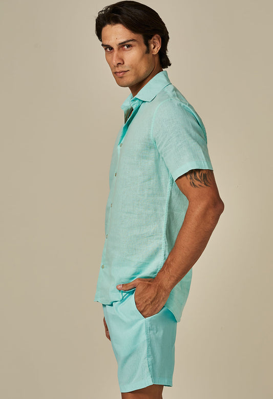 Camisa Linho Slim Manga Curta Azul Piscina