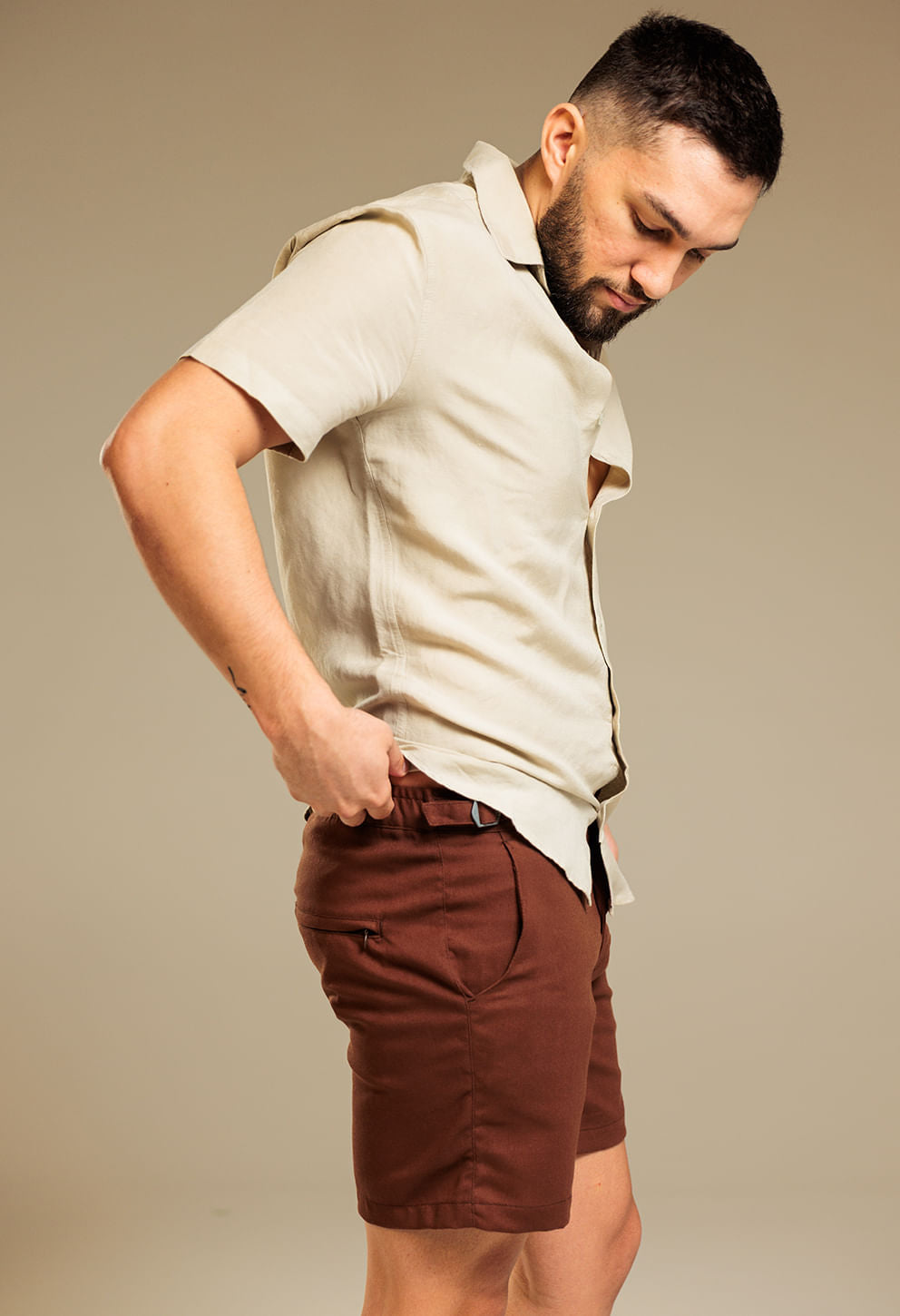 +Bermuda alfaiataria marrom Godiva com caimento reto, ajuste lateral e bolsos funcionais, perfeita para um visual elegante e confortável no dia a dia.
