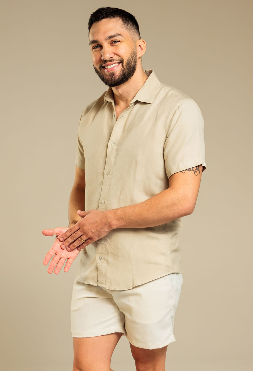 +Bermuda alfaiataria em tom natural, com mistura de linho e algodão, oferece conforto e estilo casual elegante para diversas ocasiões.