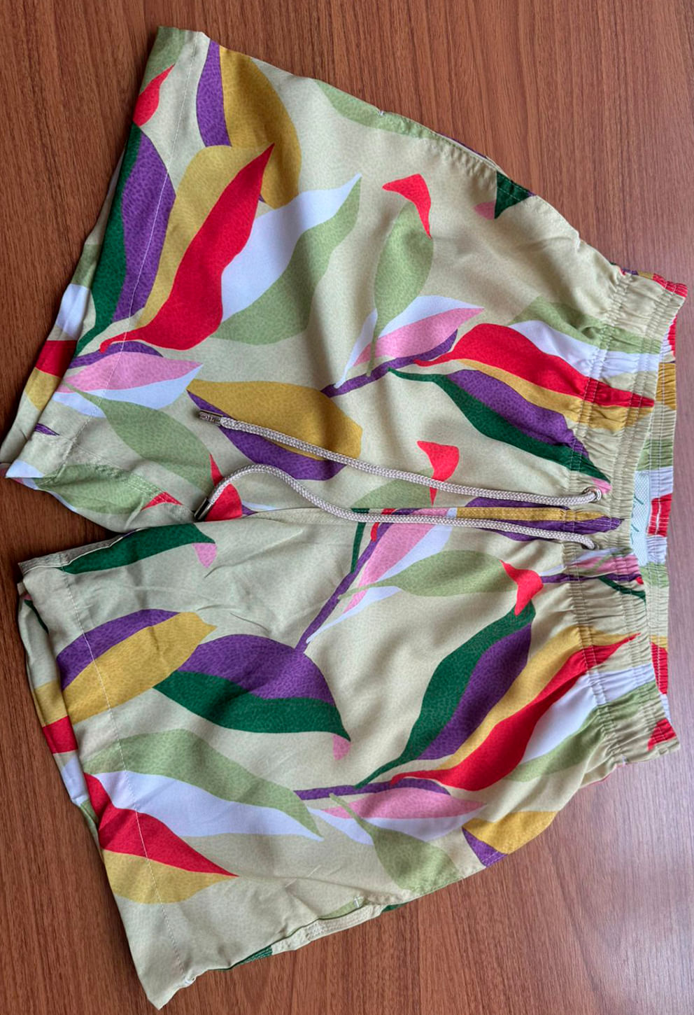 +Bermuda masculina leve com estampa floral sobre fundo bege, cós com elástico e cordão para ajuste e bolsos práticos. Ideal para praia e uso casual, un