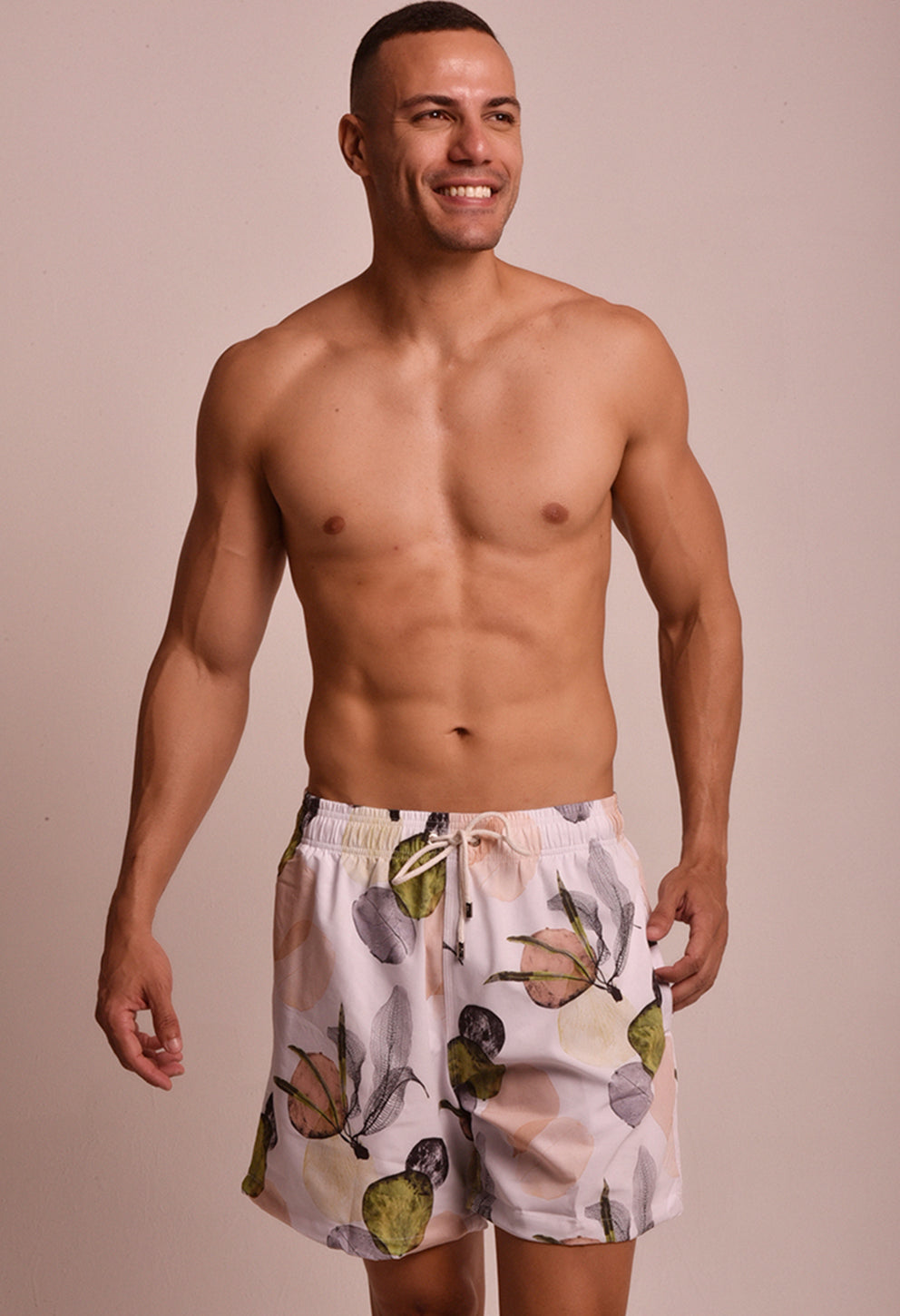 +Bermuda Beach Adulto na cor champanhe com estampa floral, ideal para momentos de lazer com conforto e estilo. Possui bolsos funcionais e cós ajustável
