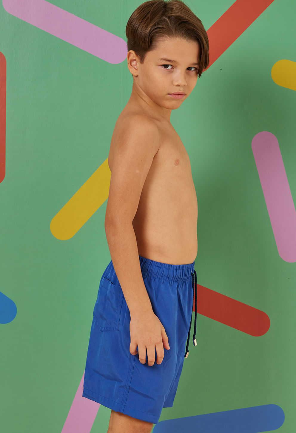 +Bermuda infantil em azul royal com cós elástico e cordão para ajuste, bolsos funcionais e modelagem prática — ideal para brincar com conforto e estilo