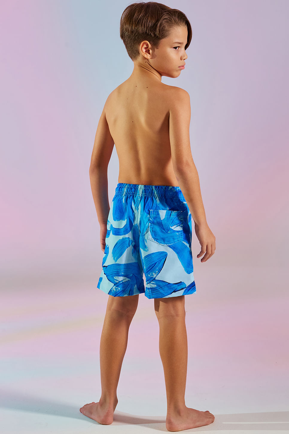 +Bermuda infantil Oceania com estampa abstrata em tons de azul, cós elástico com cordão ajustável e bolsos práticos. Conforto e estilo para dias de sol