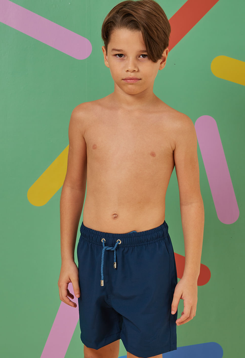 +Bermuda infantil em tom petróleo com cós elástico e amarração, bolsos laterais e traseiro; prática e confortável para brincar na praia ou no dia a dia