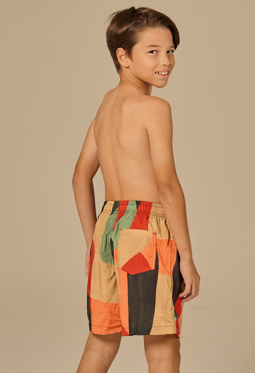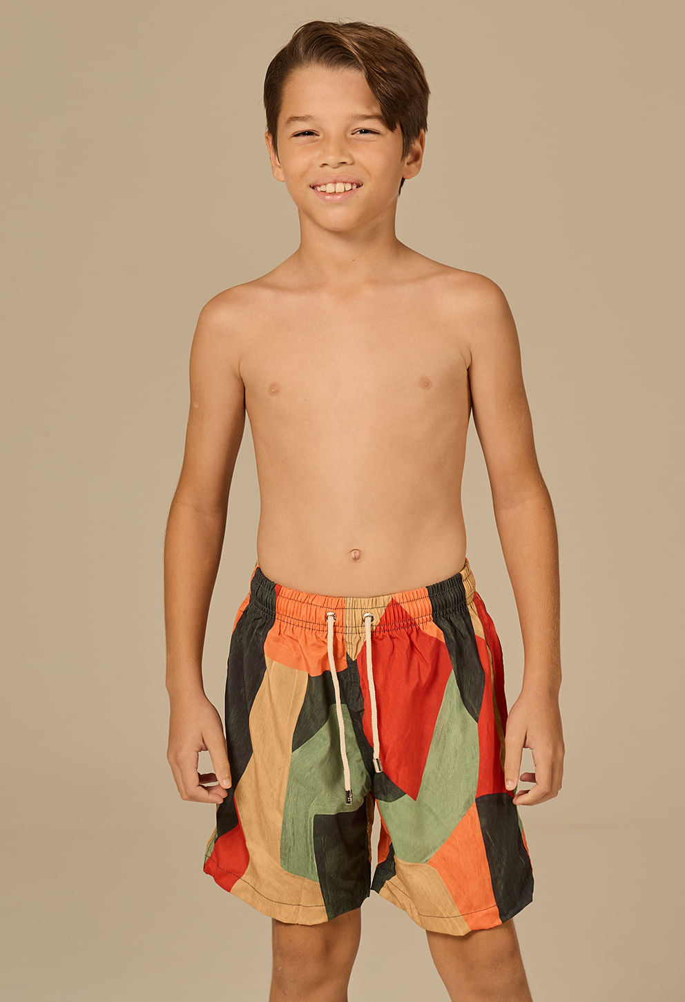 +Bermuda infantil com estampa colorida em tons de laranja, com cós elástico e cordão ajustável para conforto e liberdade em dias de praia.