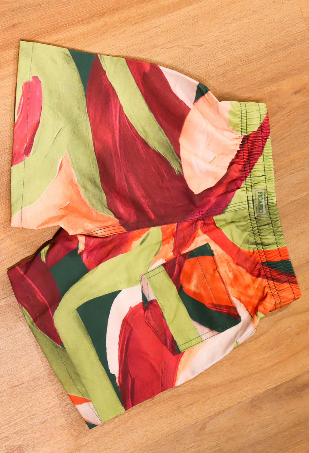 +Bermuda infantil em algodão orgânico com estampa colorida e cós elástico com cordão, oferecendo ajuste seguro e conforto para crianças de 2 a 12 anos.