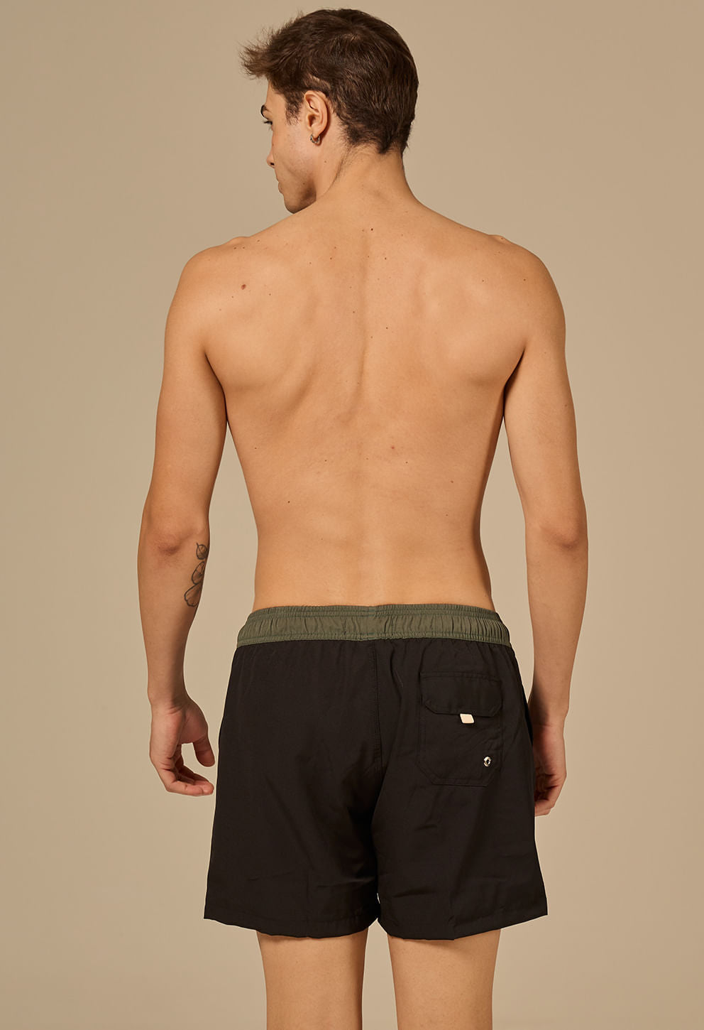 +Bermuda Casual Búzios em preto com cós jungle green, feita em tecido leve com cós elástico e amarração. Conforto diário, bolsos práticos e design vers