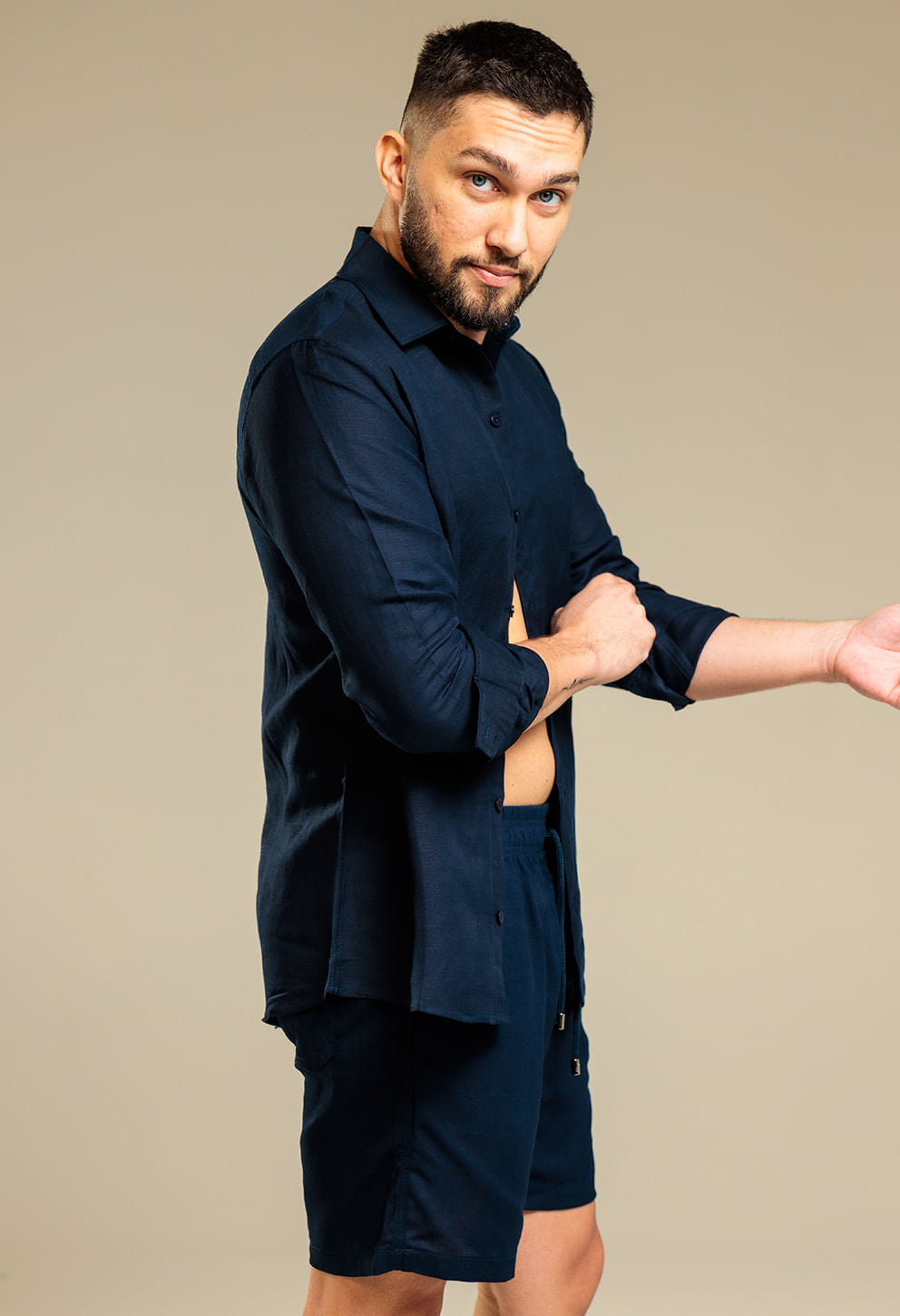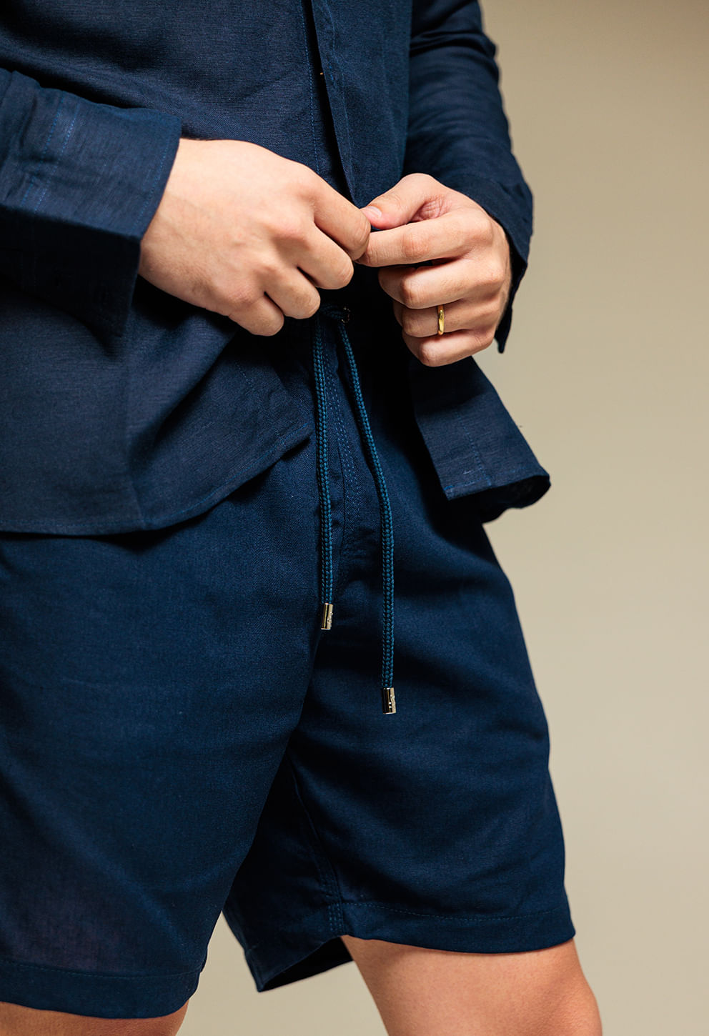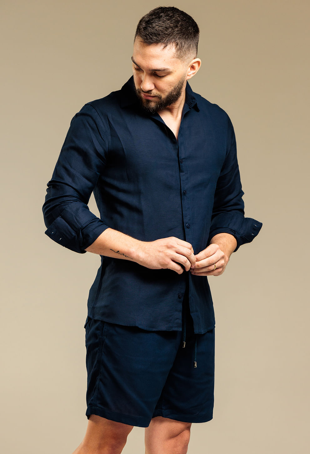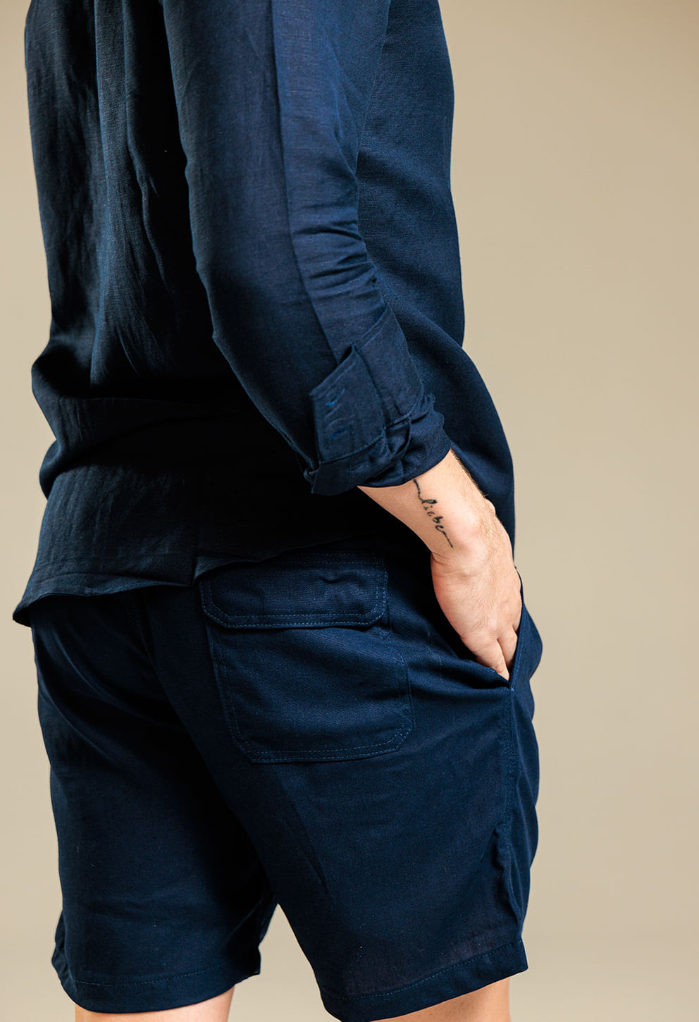 Bermuda casual em linho azul-marinho, perfeita para quem busca conforto e elegância em ocasiões informais. Modelagem reta e detalhes refinados valoriz