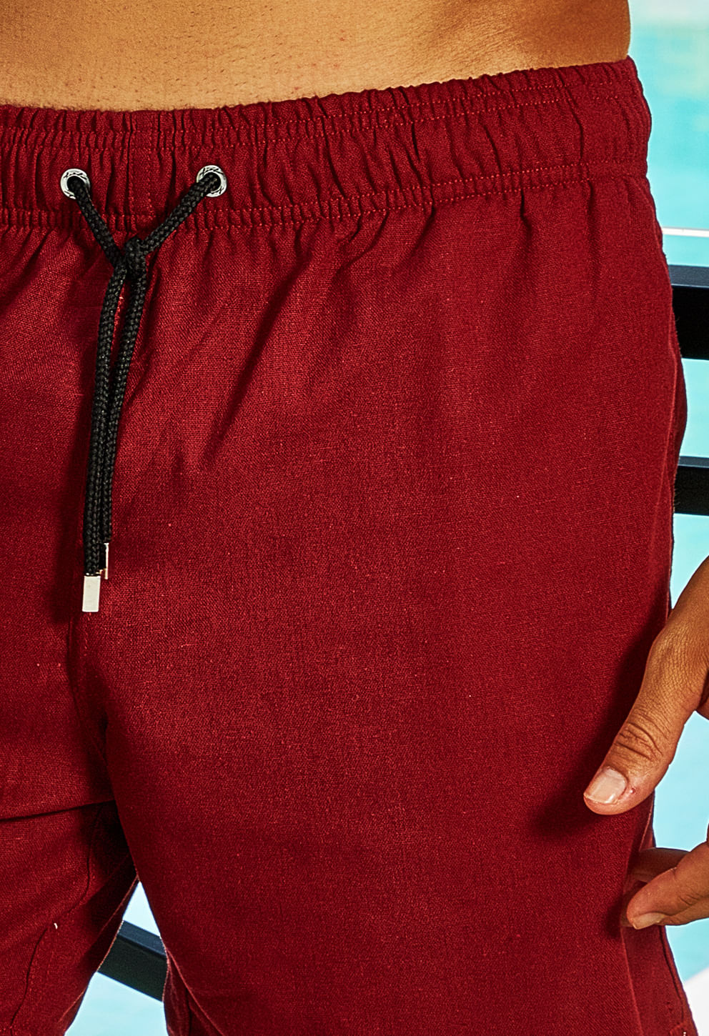 +Bermuda casual em vermelho escuro, confeccionada em tecido leve com cós elástico e cordão para ajuste. Ideal para momentos de lazer, oferece conforto,