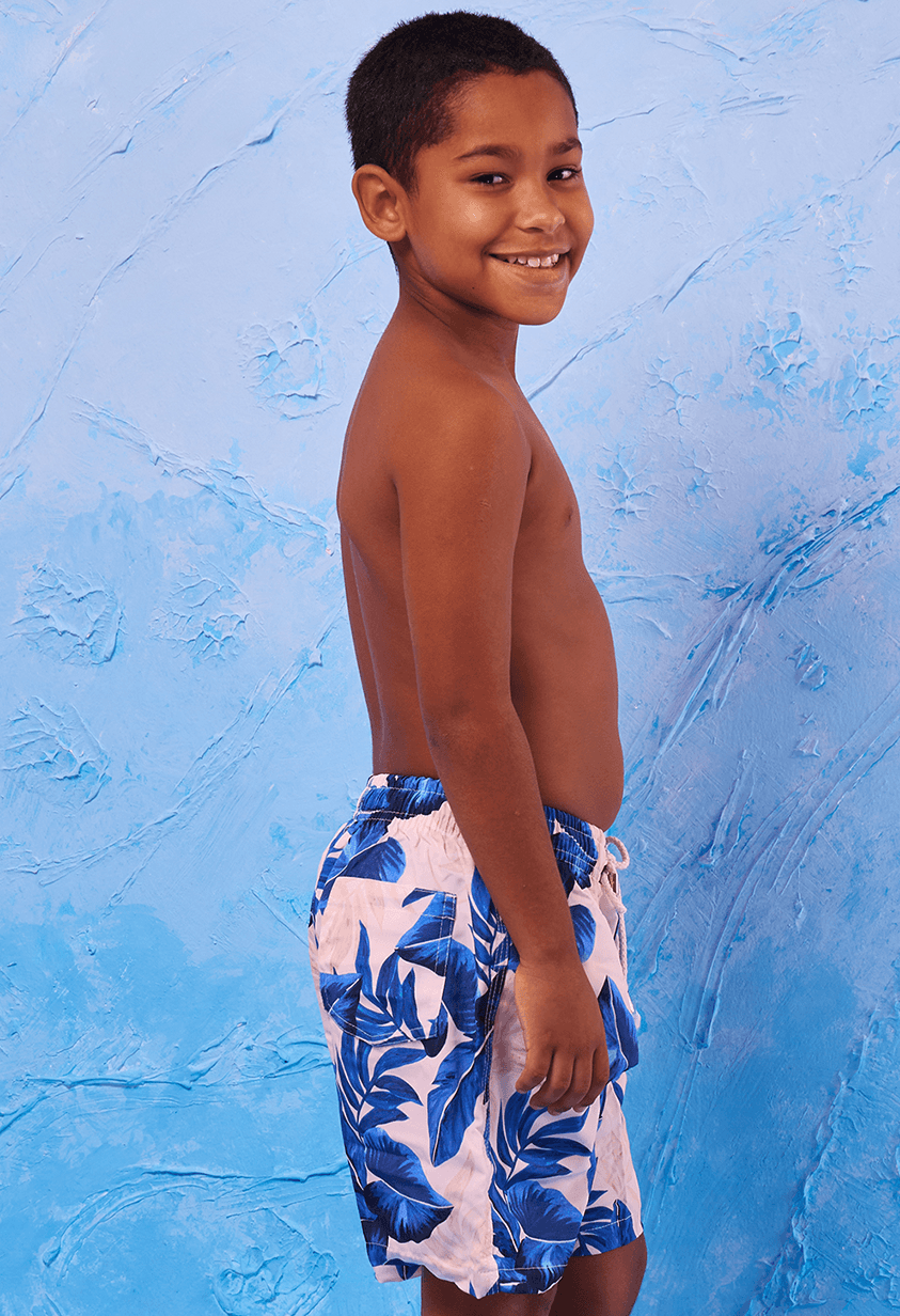 +Bermuda infantil azul com cós elástico e amarração, oferecendo ajuste perfeito e conforto para o dia a dia das crianças. Conta com bolsos laterais e o