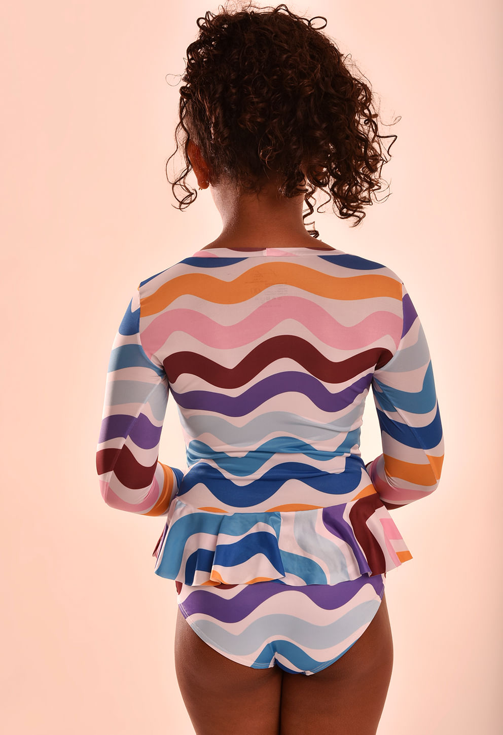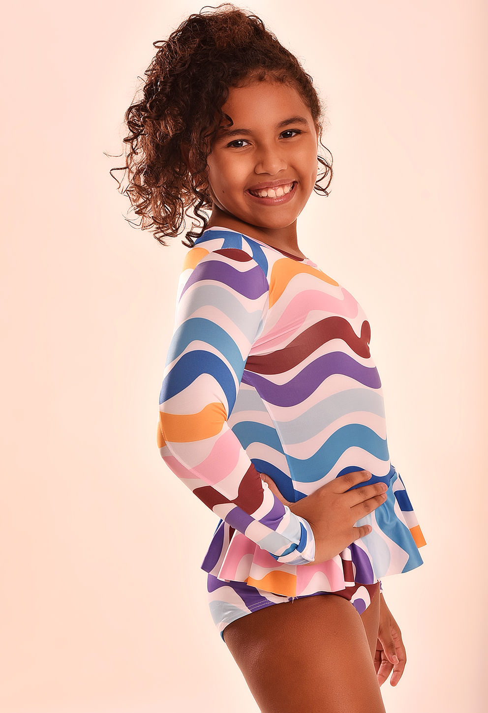 Design alegre com cores vibrantes e tecido confortável que protege do sol e permite liberdade de movimento.