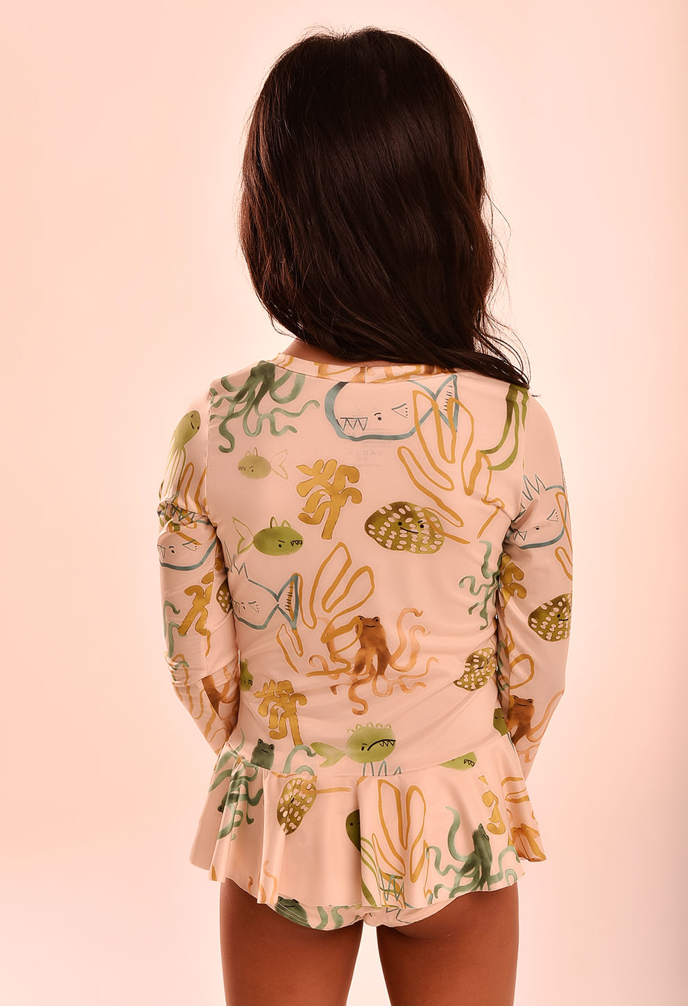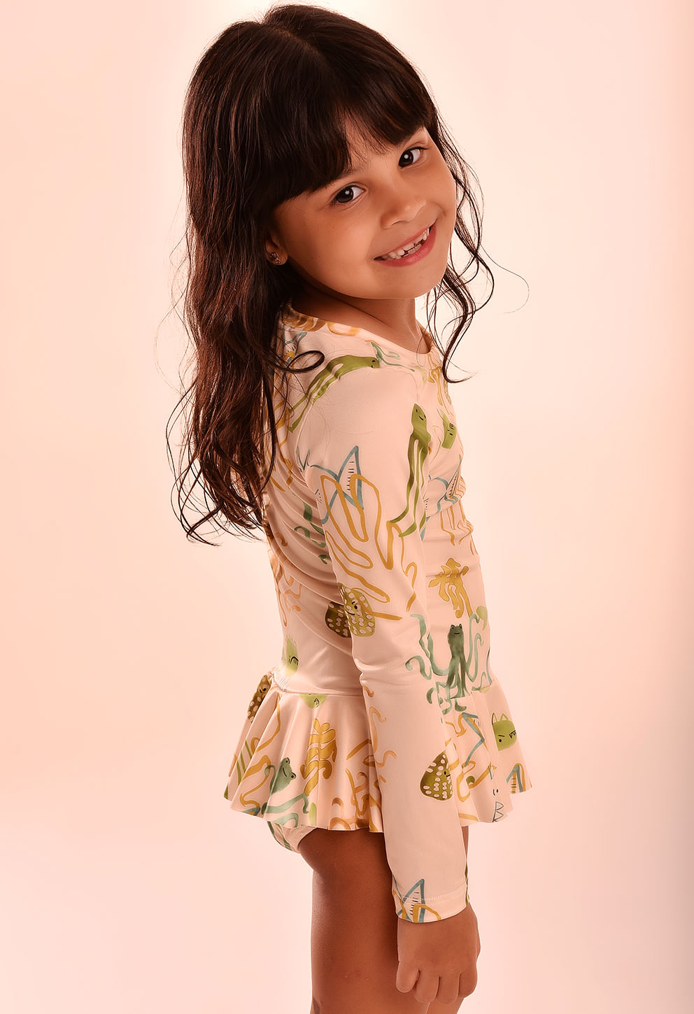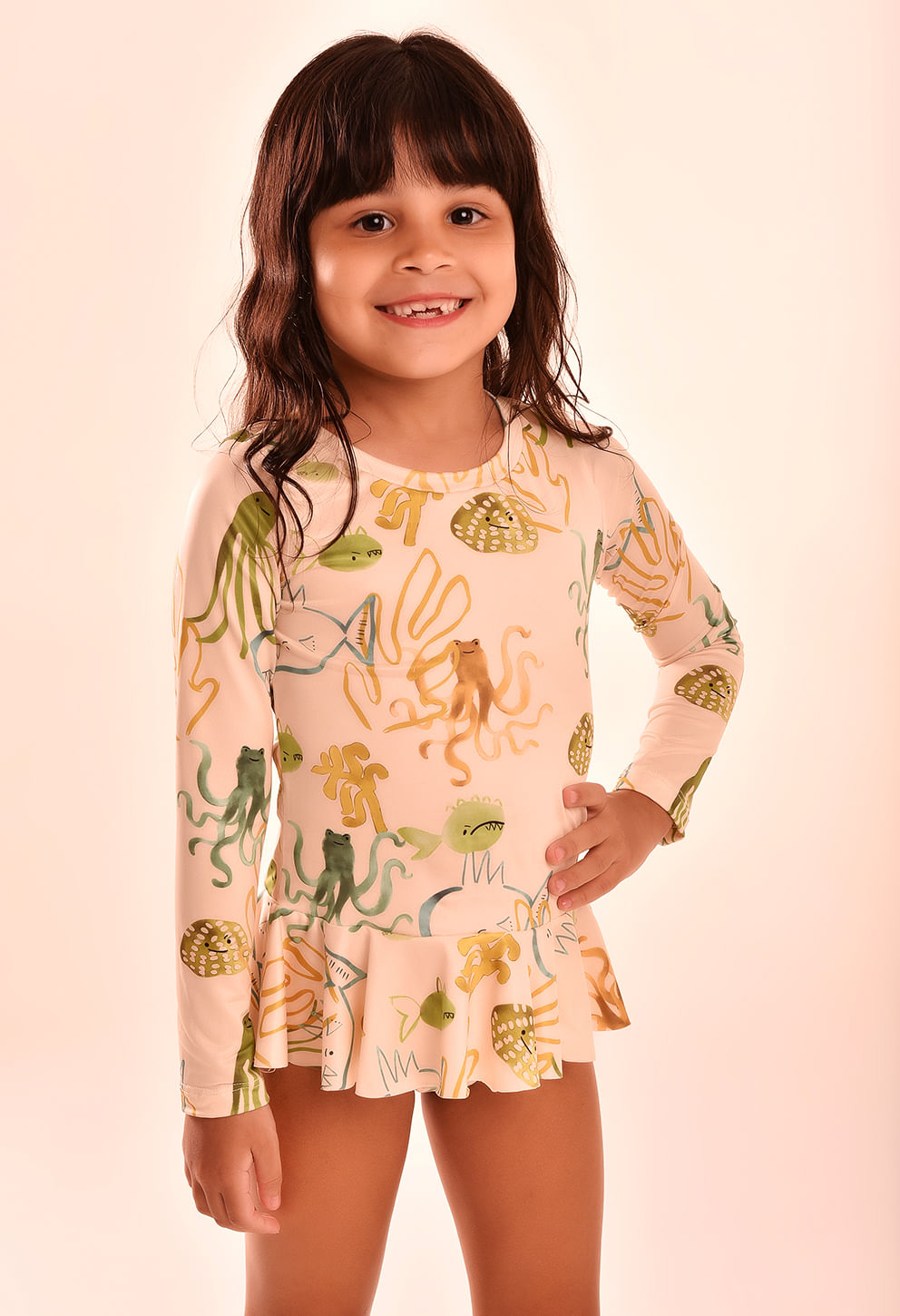 +Biquíni infantil de manga longa com saia rodada e estampa divertida de animais marinhos. Confortável, com modelagem pensada para brincar no mar e seco