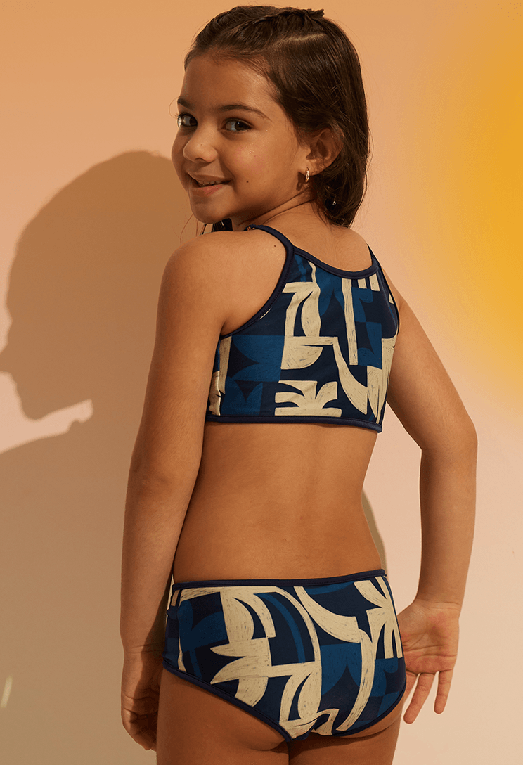 +Biquíni infantil com estampa abstrata em azul e bege, confortável e pensado para proteger a pele das crianças com FPU 50+. Ideal para praia e brincade