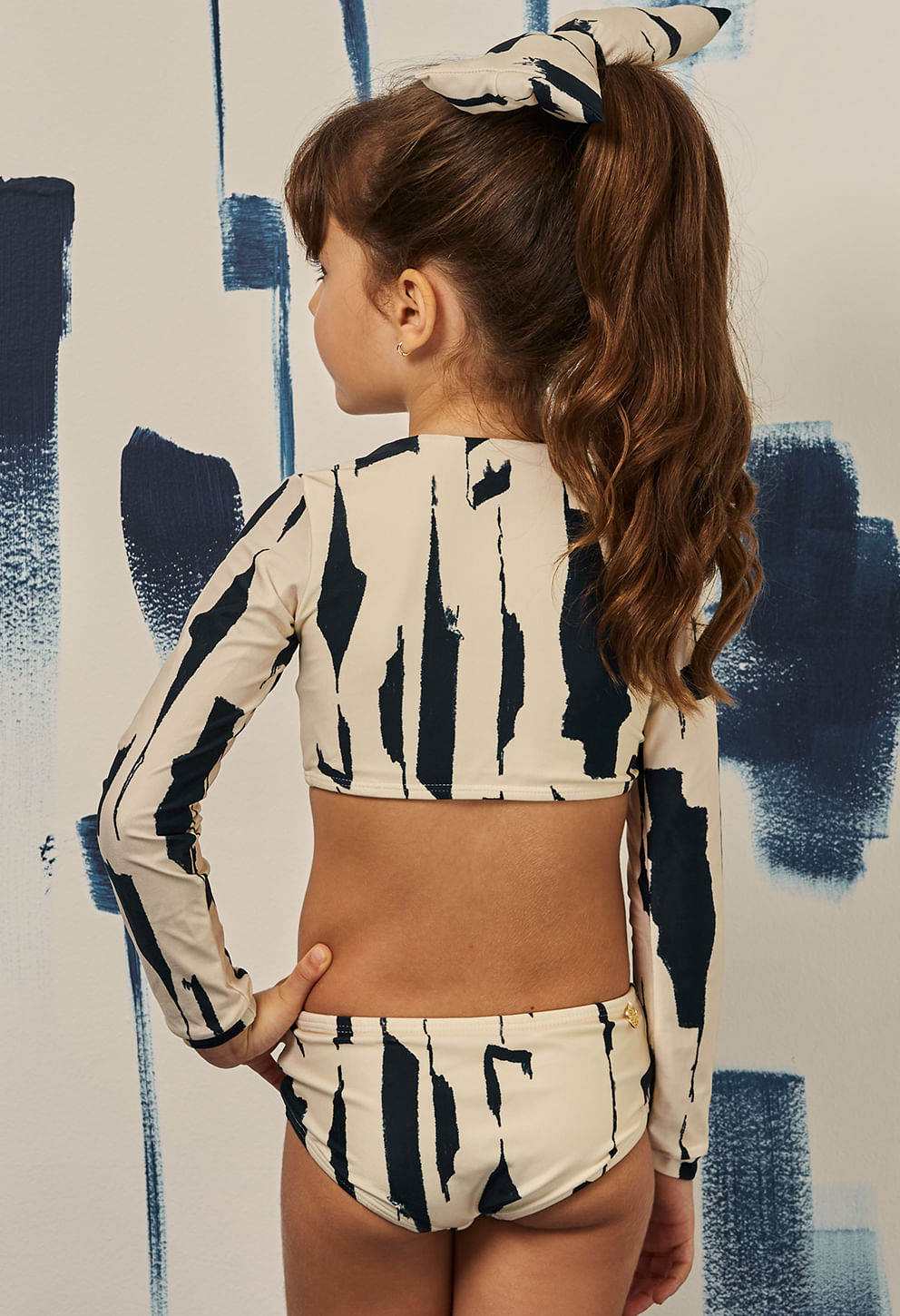 +Biquíni infantil com manga longa, estampa abstrata em bege e preto e proteção UV FPU 50+. Confortável, resistente e pensado para proteger a pele das C