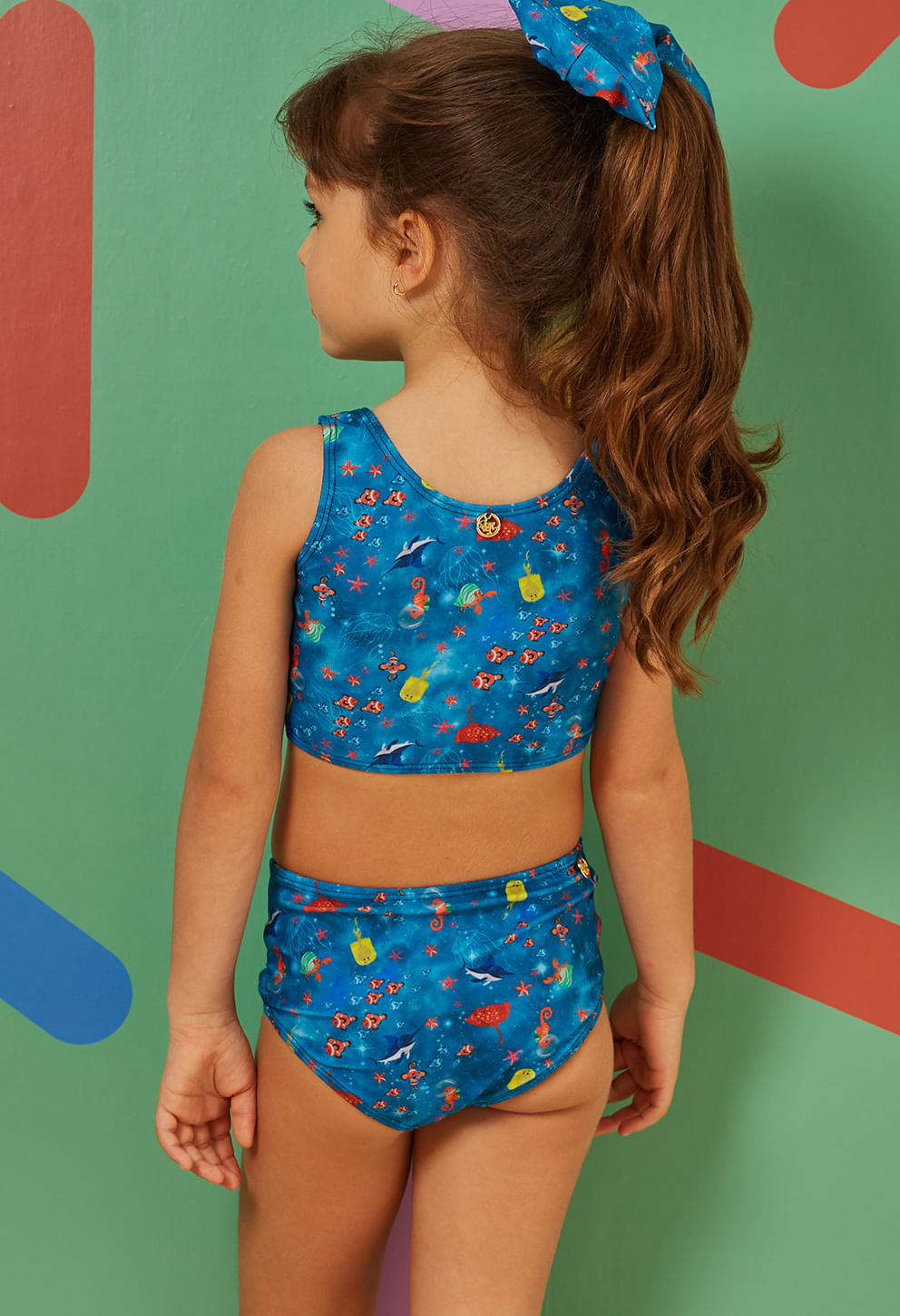 +Biquíni infantil com estampa marítima colorida, design confortável e proteção UV FPU 50+. Top regata e hot pant de cintura alta para liberdade demovim