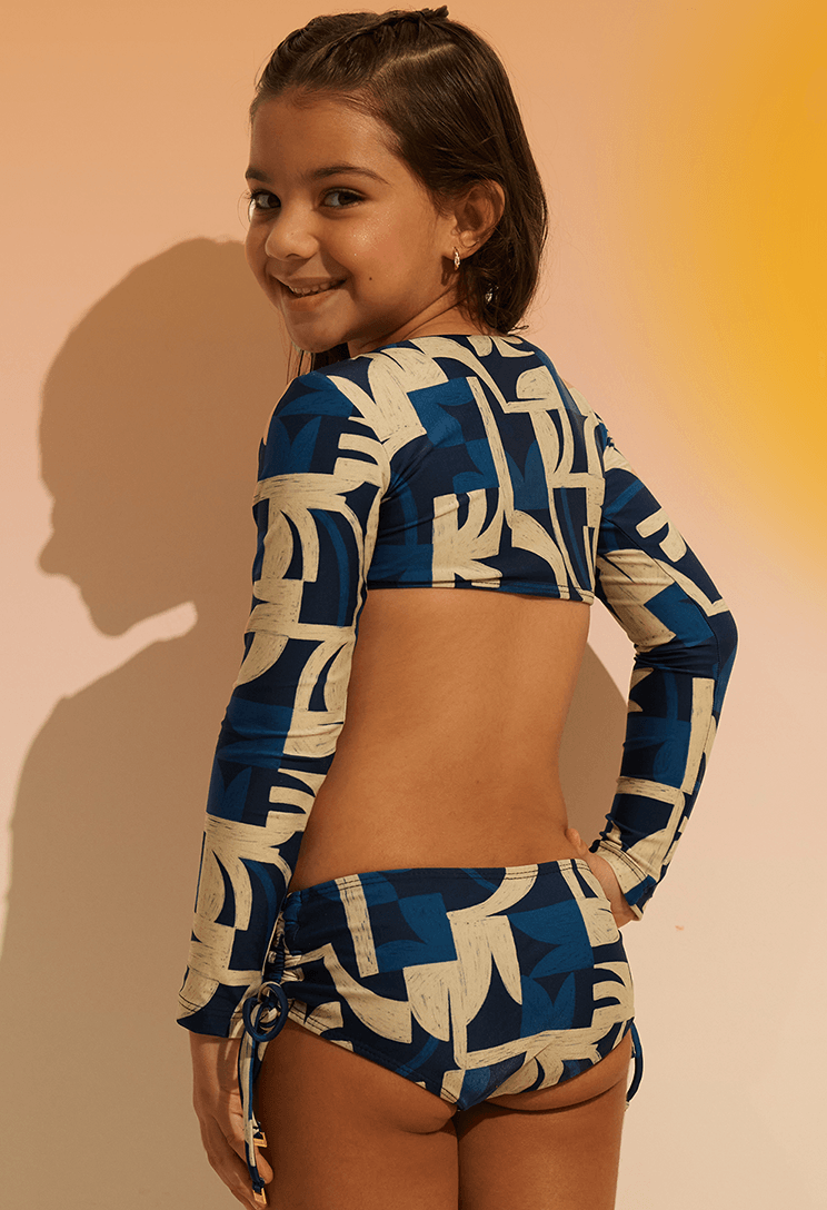 +Biquíni infantil Valentina Costeira com estampa azul e bege, tecido macio, FPU 50+ e modelagem confortável para brincar e aproveitar o sol com estilo.