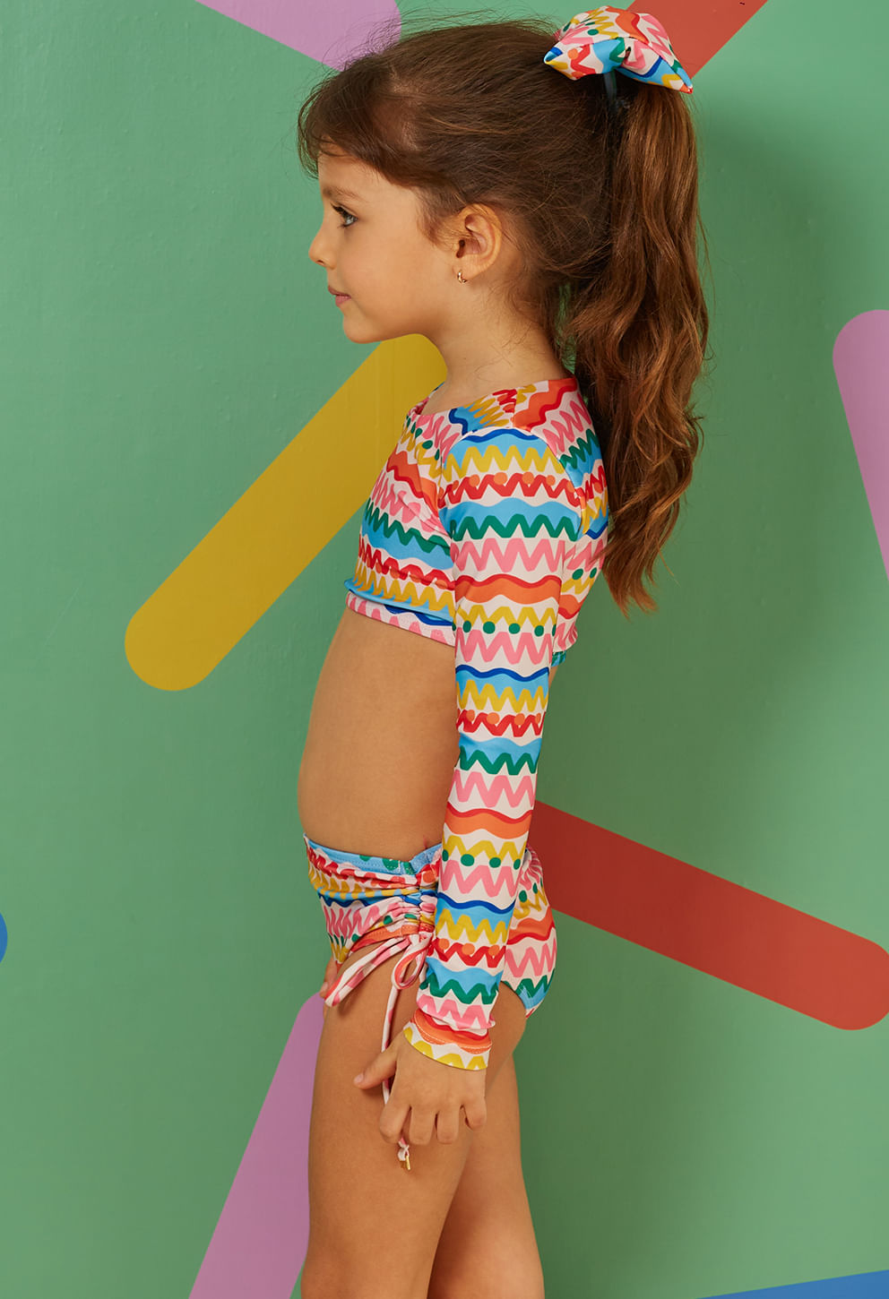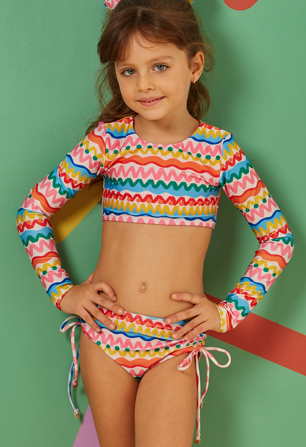 +Biquíni infantil com estampa vibrante, modelagem cropped de manga longa e calcinha com amarrações laterais. Conforto, proteção e estilo para brincar e