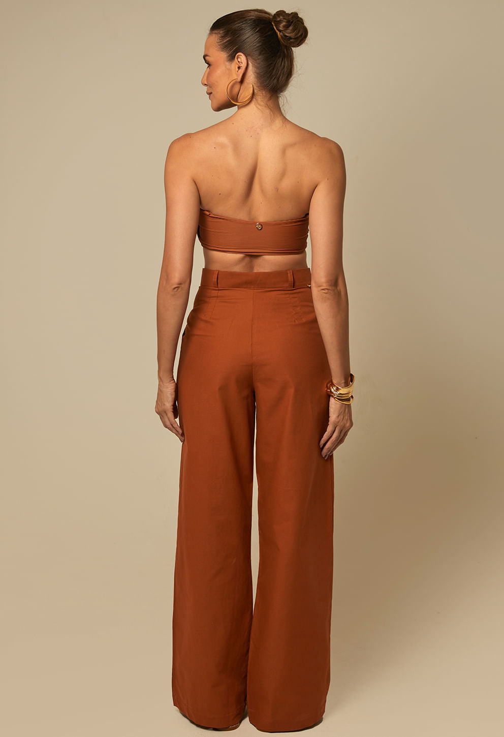 +Calça pantalona sofisticada em terracota, com modelagem ampla, cintura alta, pregas frontais e bolsos faca. Peça elegante com caimento leve e aviagens