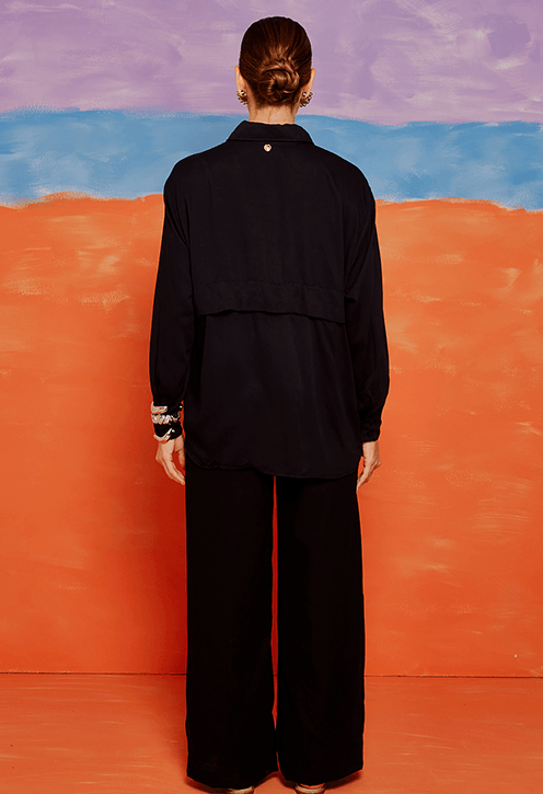Tecido fluido com caimento elegante e acabamento refinado; aviamentos dourados com banho em ouro para um toque sofistico