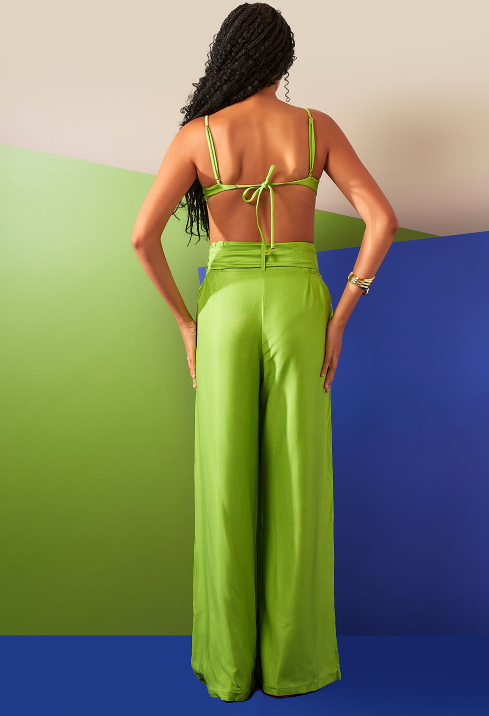 +Calça pantalona com cós clochard e faixa para amarração, tecido de caimento fluido e bolsos faca. Detalhes refinados como botões forrados e zíper na f