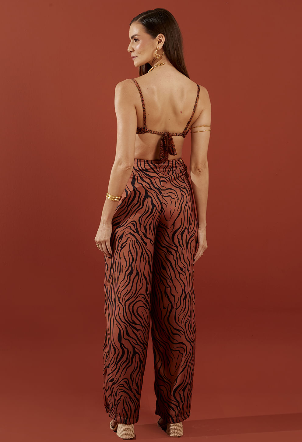 +Calça pantalona em tecido fluido com estampa animal print Savana, cintura alta e caimento soltinho. Perfeita para looks elegantes e confortáveis na be
