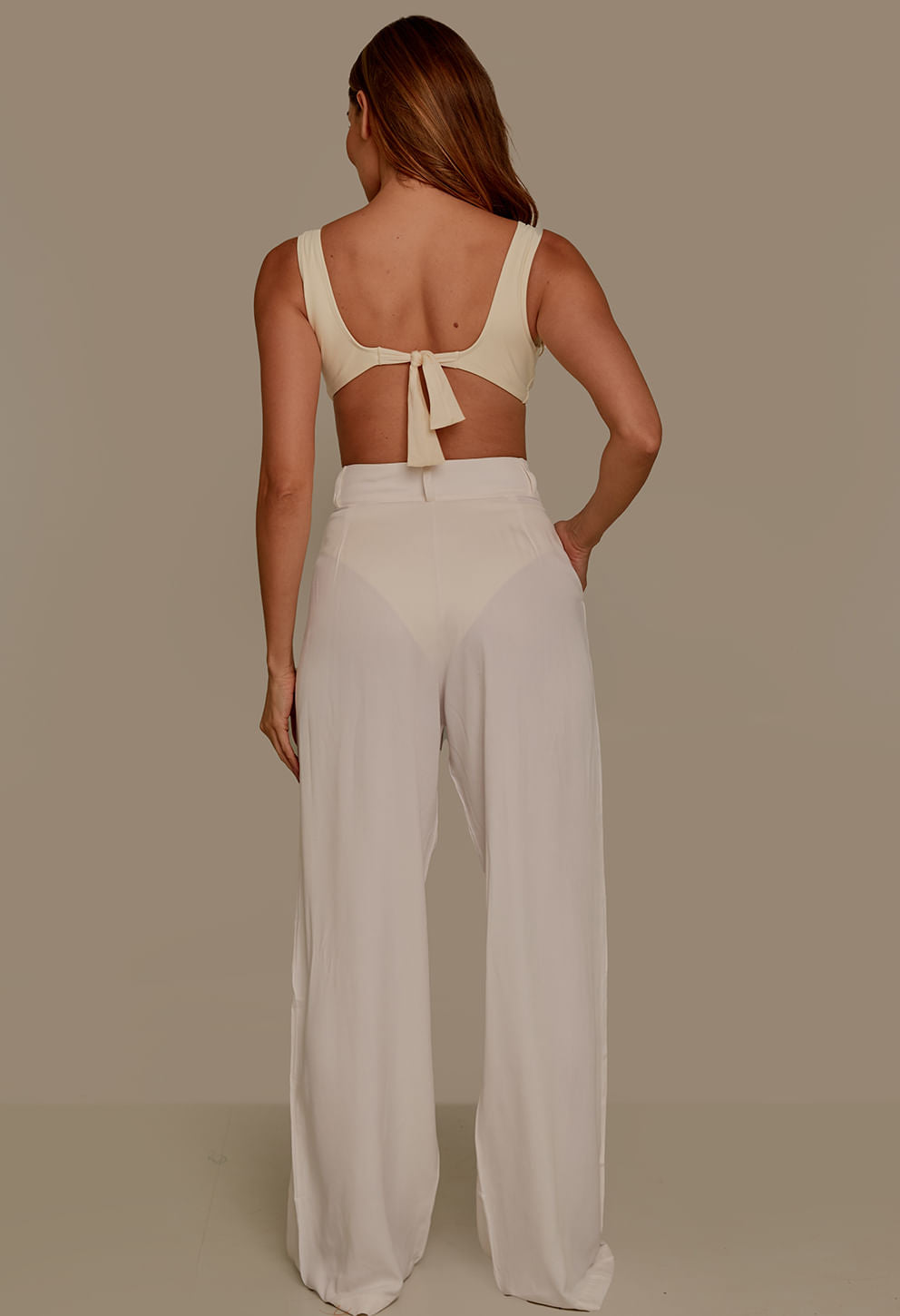 +Calça pantalona social branca com cintura alta e caimento amplo. Peça elegante e versátil, feita em tecido leve para conforto ao longo do dia; ideal a
