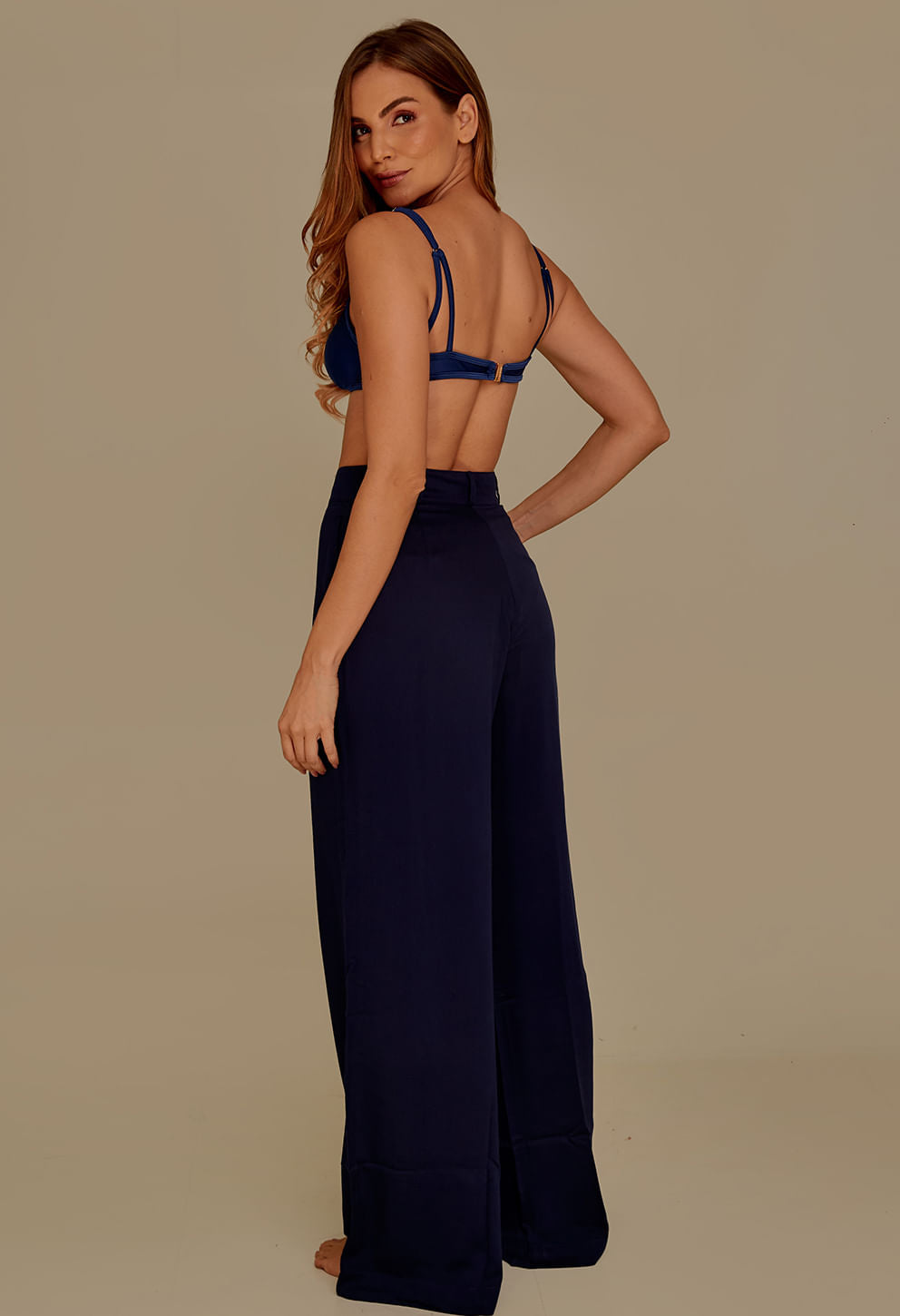 +Calça pantalona marinho em viscose com caimento fluido e cintura alta. Peça elegante e versátil, com acabamento premium e materiais certificados, que