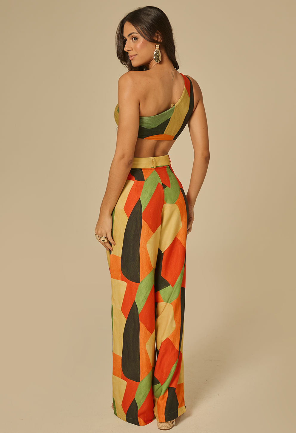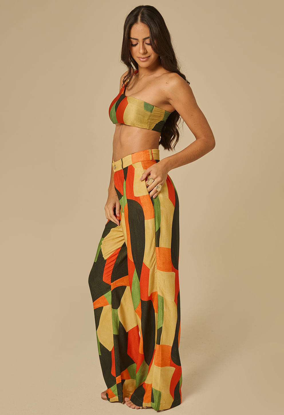 +Calça pantalona social com estampa geométrica em tons quentes, confeccionada em 100% viscose leve e fresca. Possui cós com braguilha, zíper e botão, e