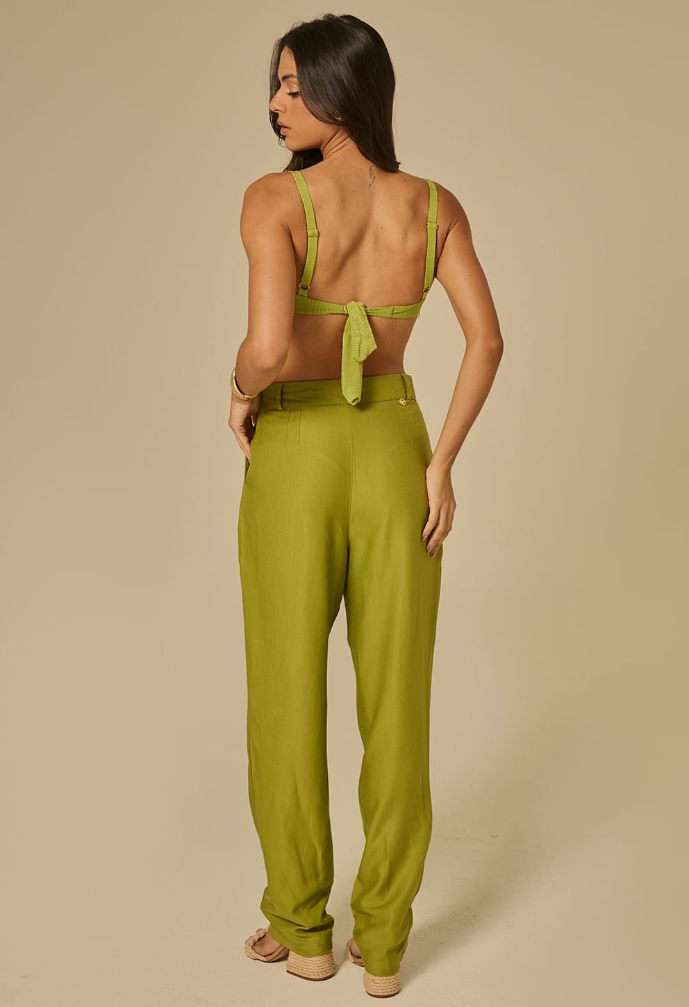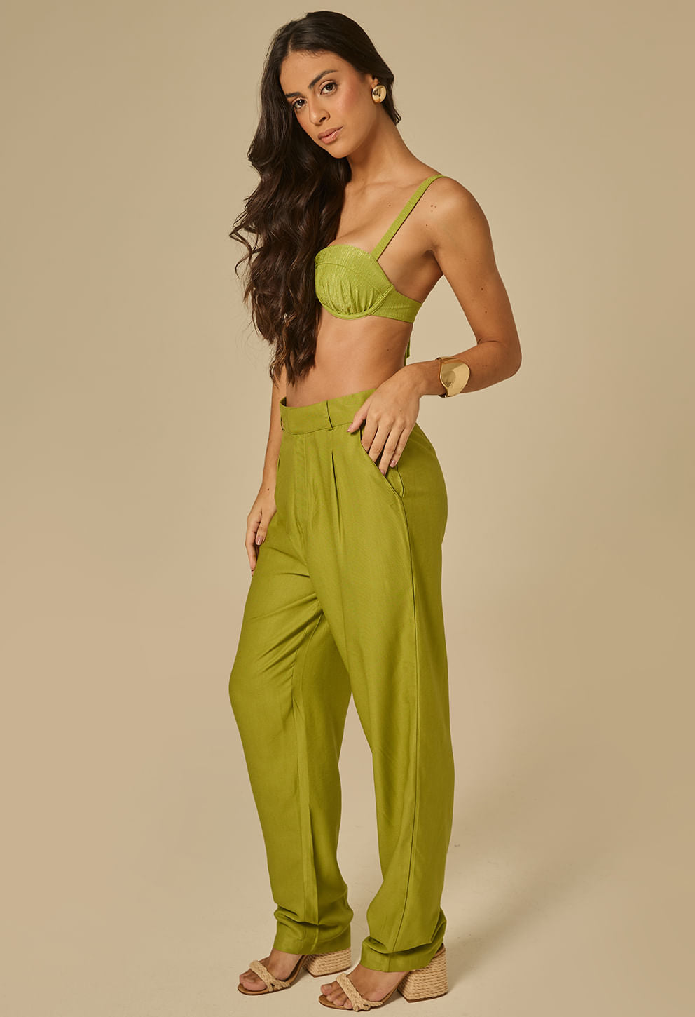 +Calça reta verde esmeral confeccionada em viscose 100%, com pregas frontais e bolsos laterais, ideal para um visual sofisticado e confortável em ocasi