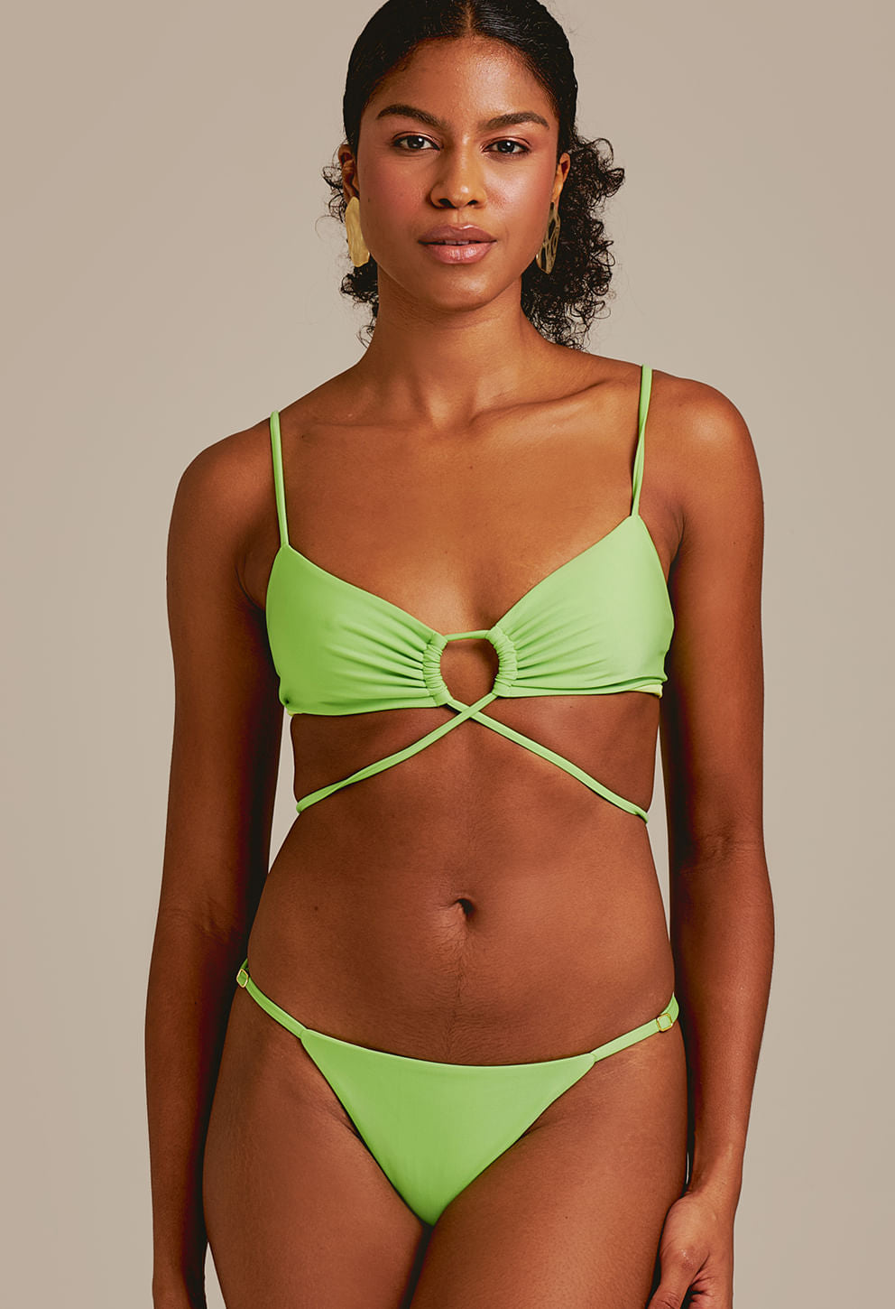 +Calcinha semi fio na cor limão com regulador nas laterais para ajuste personalizado, tecido com leve brilho e proteção UV FPU 50+. Conforto e estilo à
