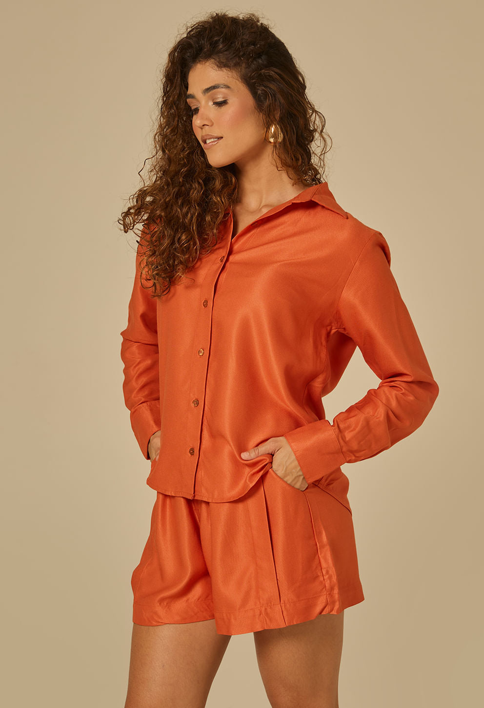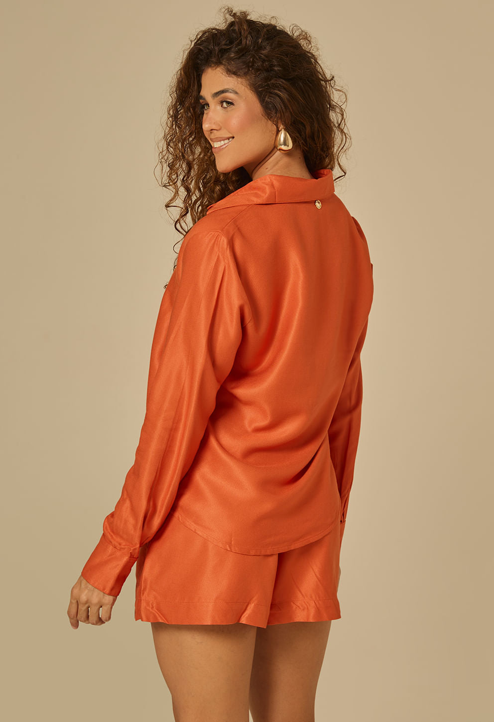 +Camisa Gabriela Sunset em viscose acetinada com modelagem slim que valoriza a silhueta. Detalhes dourados banhados a ouro conferem sofisticação e vers