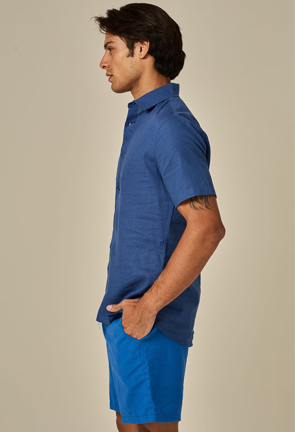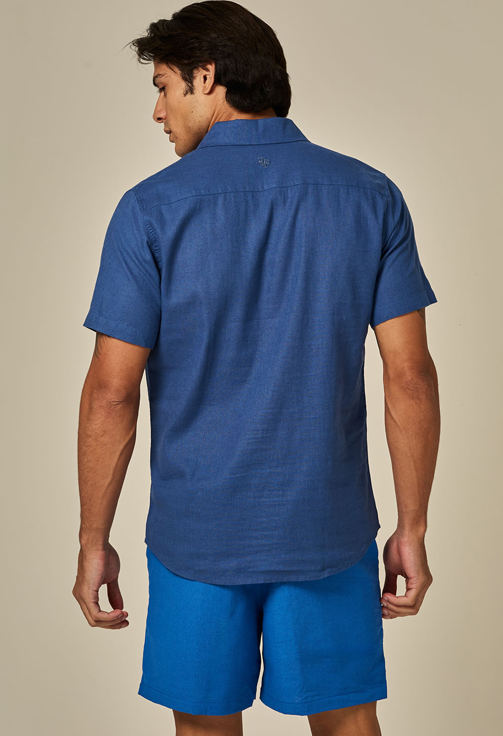 +Camisa slim de linho e viscose na cor índigo, leve e fresca para o dia a dia. Corte ajustado, abotoamento frontal e caimento elegante — ideal para uso