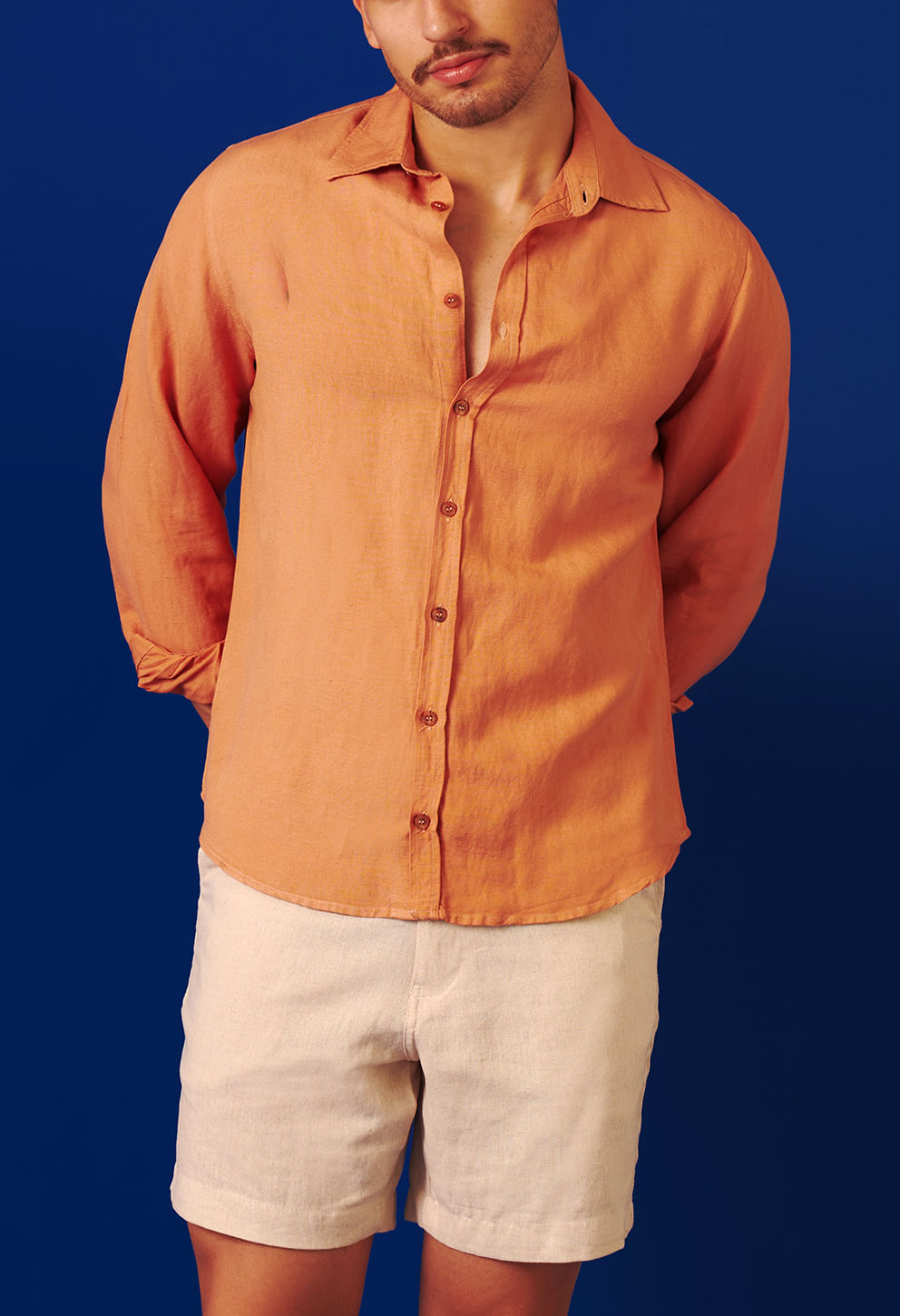 +Camisa masculina em tom coco queimado, tecido leve e caimento confortável. Ideal para looks casuais com mangas que podem ser arregaçadas para maior to