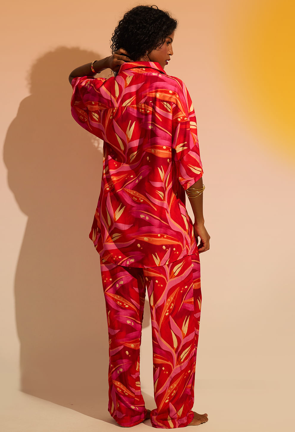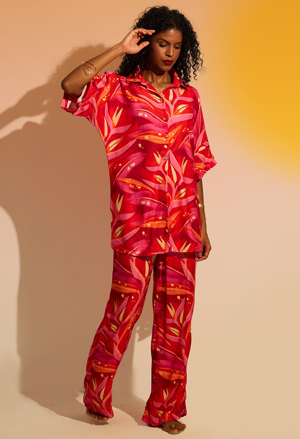 +Camisão Lúcia com estampa vibrante em rosa e vermelho, confeccionado em viscose/crepe leve e fluida, ideal para ocasiões de verão com conforto e elegâ