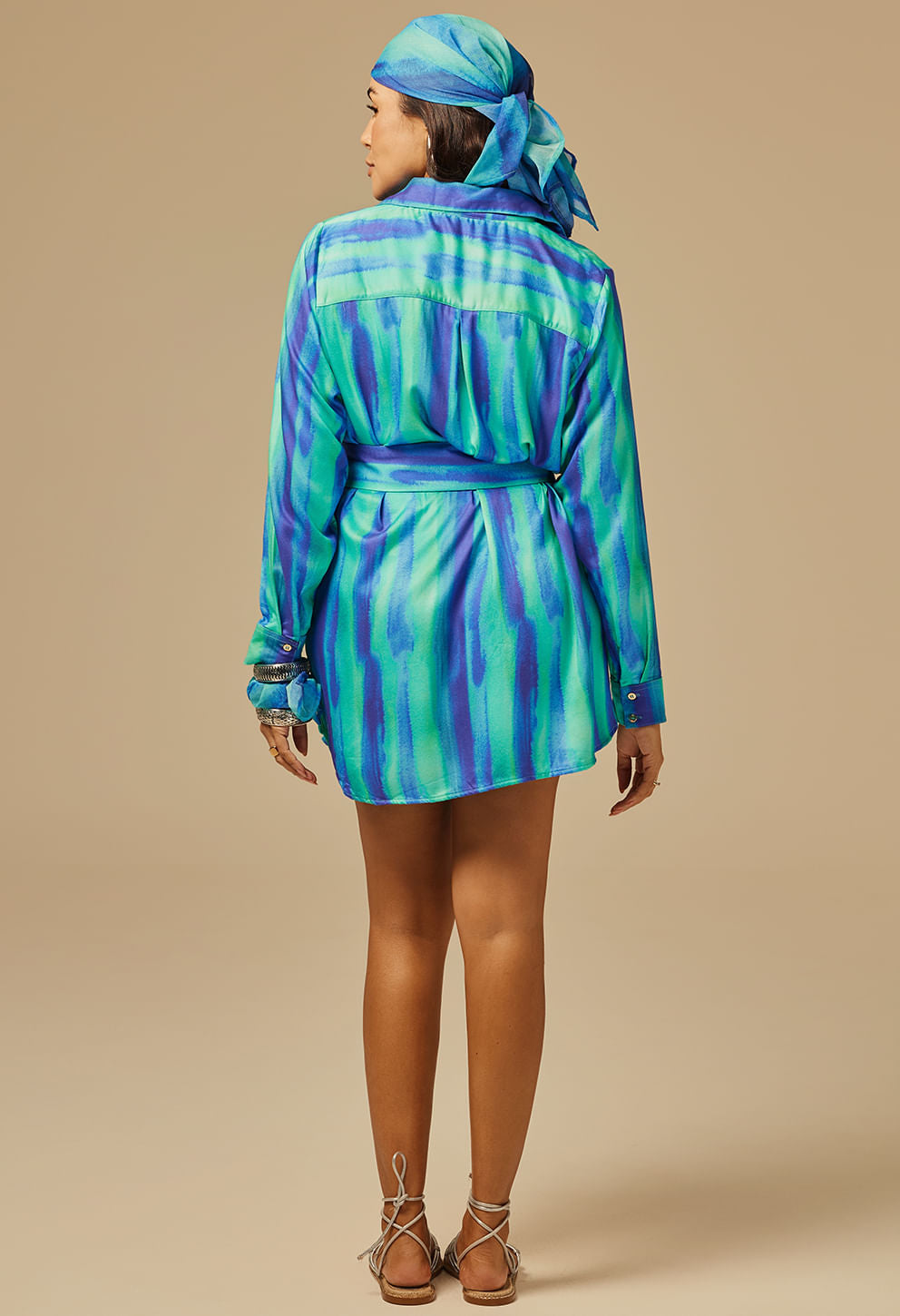 +Chemise Jaque Boreal em algodão, com estampa listrada azul e verde e cinto largo que valoriza a silhueta, perfeita para ocasiões casuais com conforto.