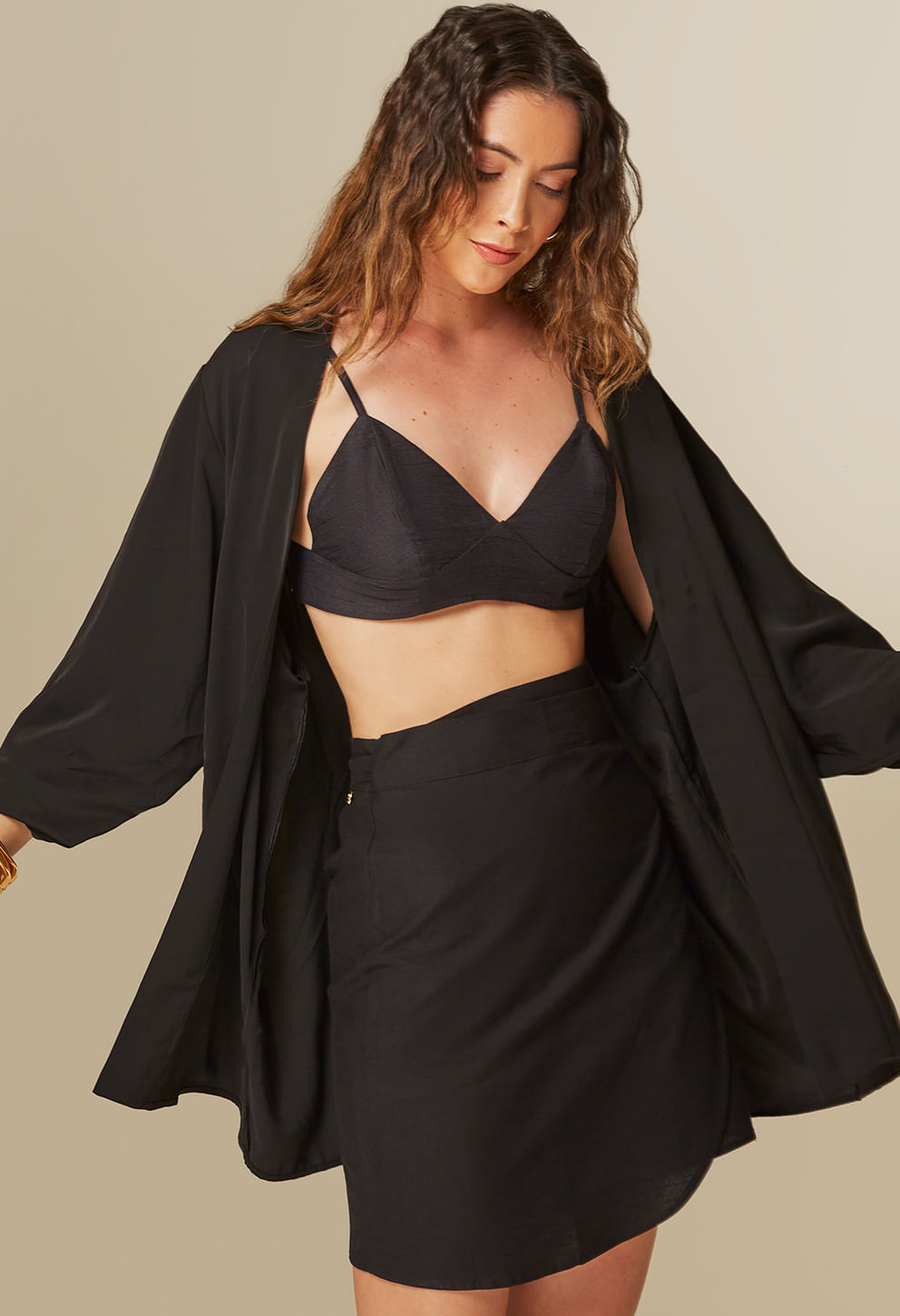 Combine o Kimono Lay Preto com o Top Lívia Preto e a Saia Nara Preto.