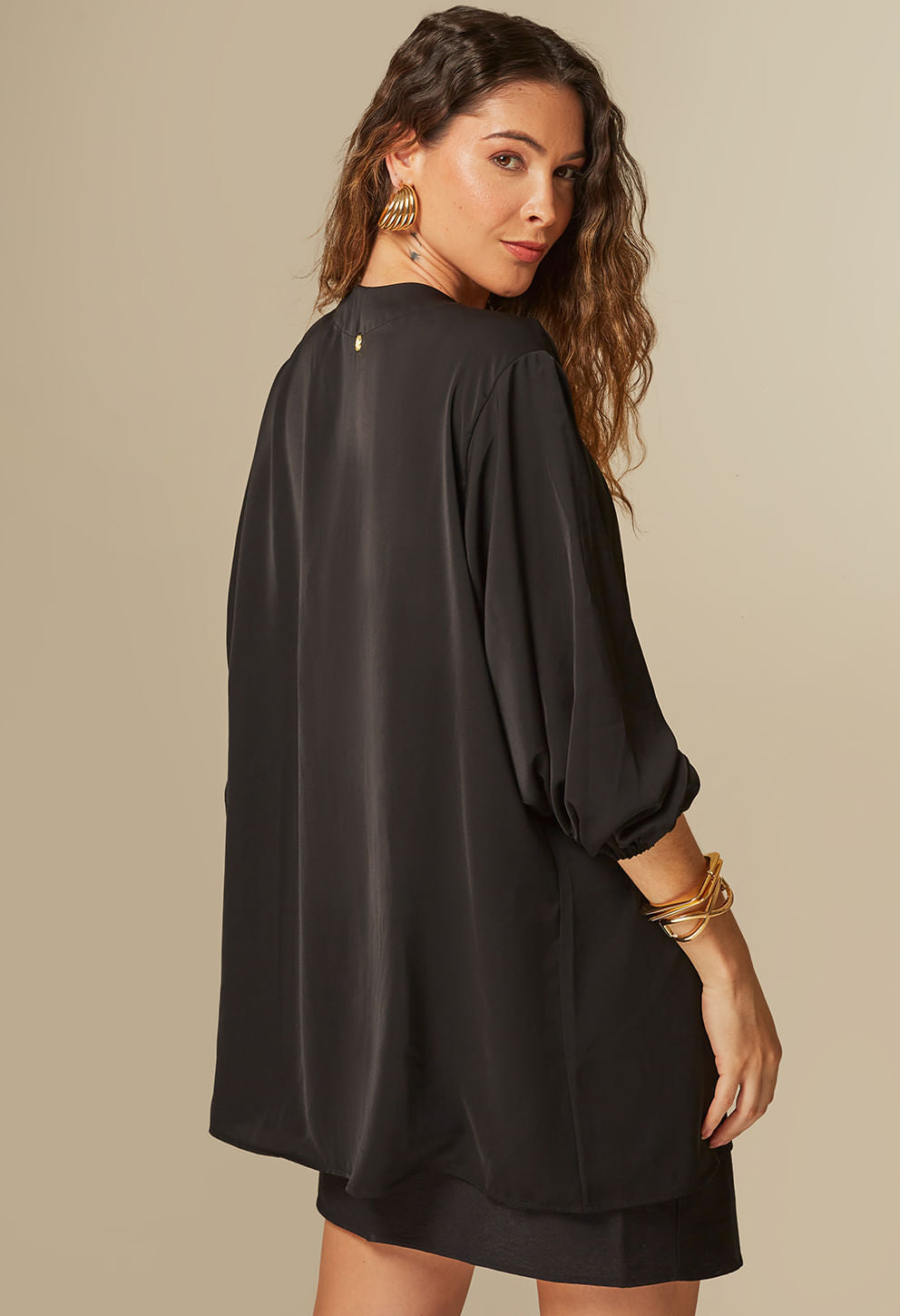 O Kimono possui comprimento alongado e oversize, modelagem reta e mangas bufantes. É a peça ideal para diversas combinações, pois é uma peça chave que pode ser utilizada como terceira peça para diversas combinações.