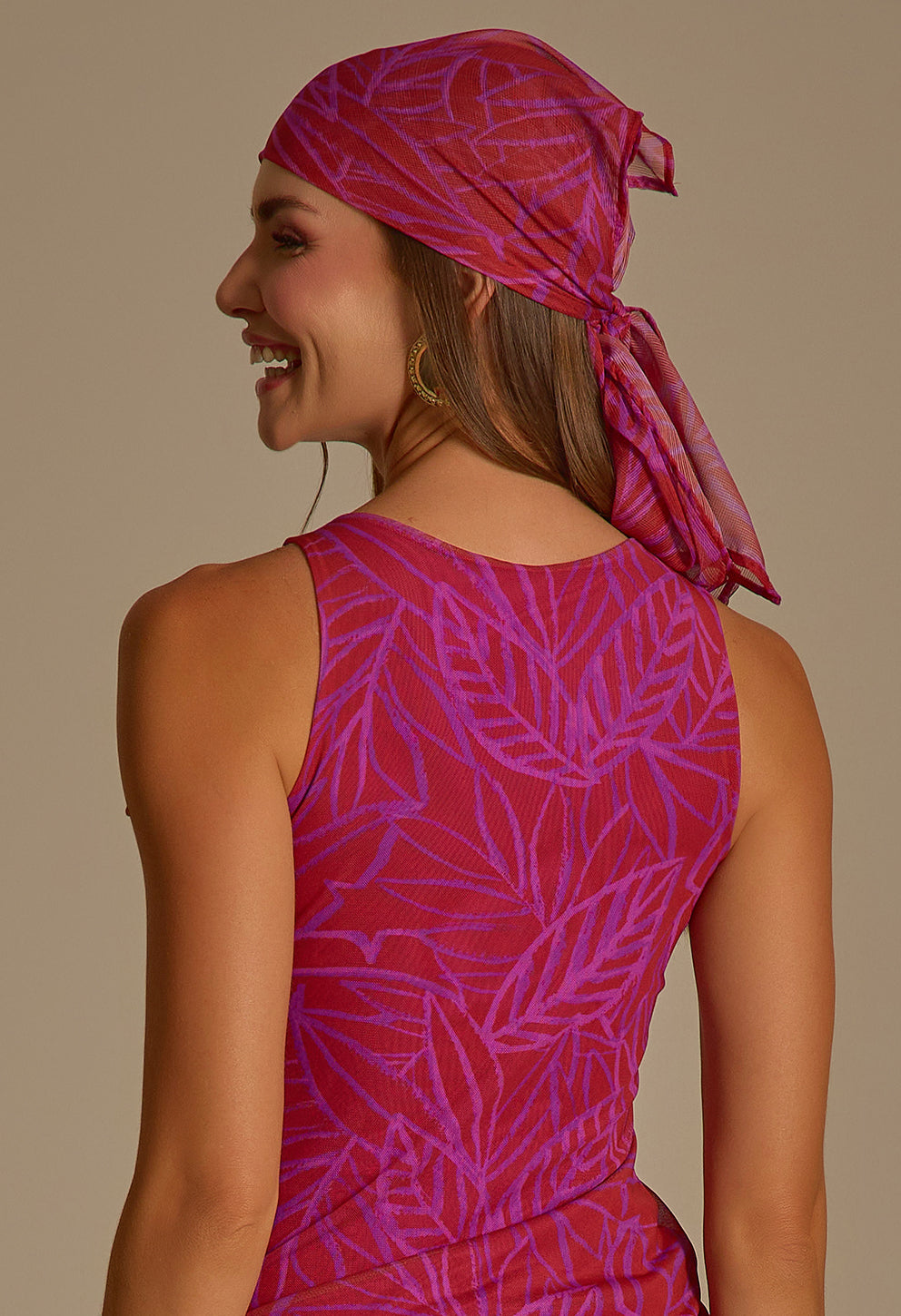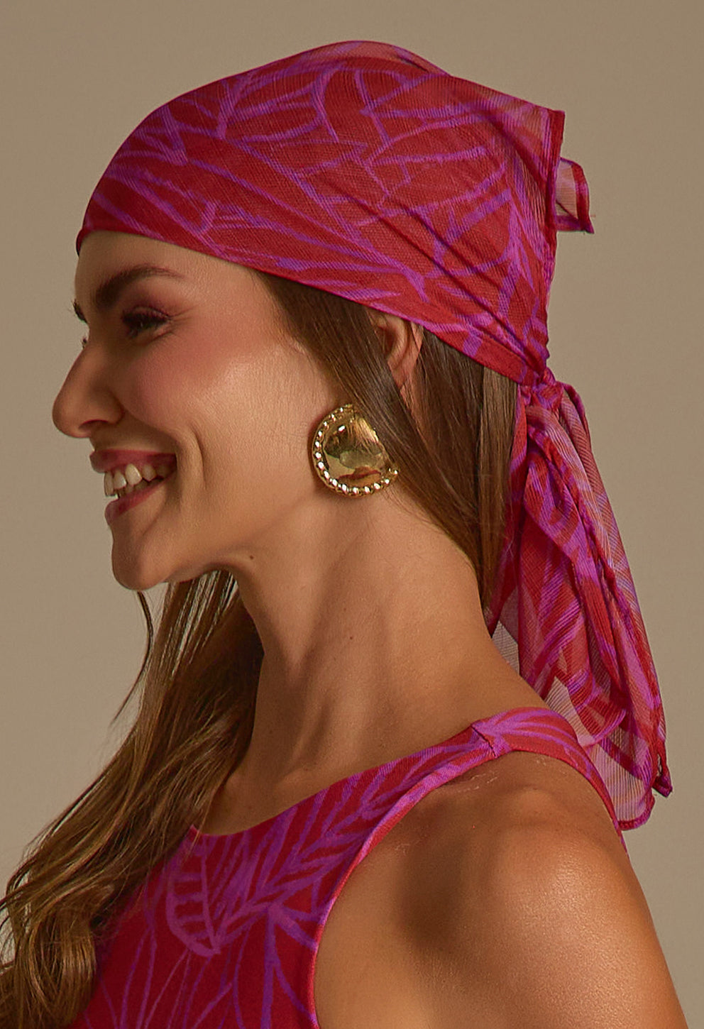 +Lenço feminino em tecido leve e translúcido com estampa de folhas em tons de vermelho e roxo, ideal para complementar looks com estilo e elegância. Tê