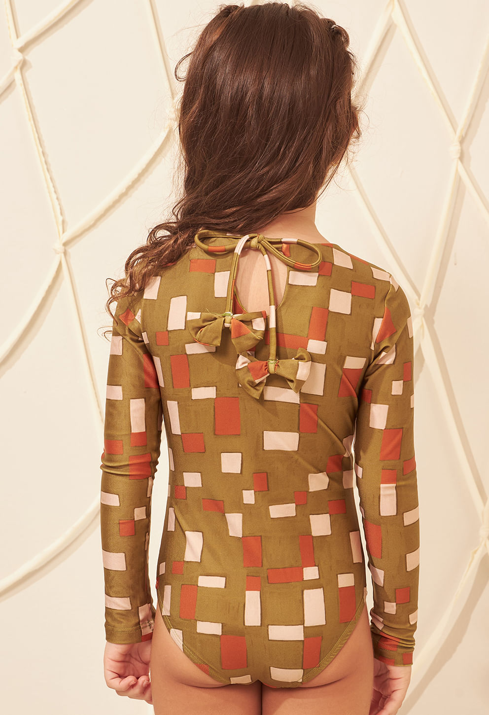 +Maiô infantil com estampa geométrica e mangas longas, ideal para praia e piscina. Tecido macio com compressão suave, proteção UV50 e aviamentos banhos