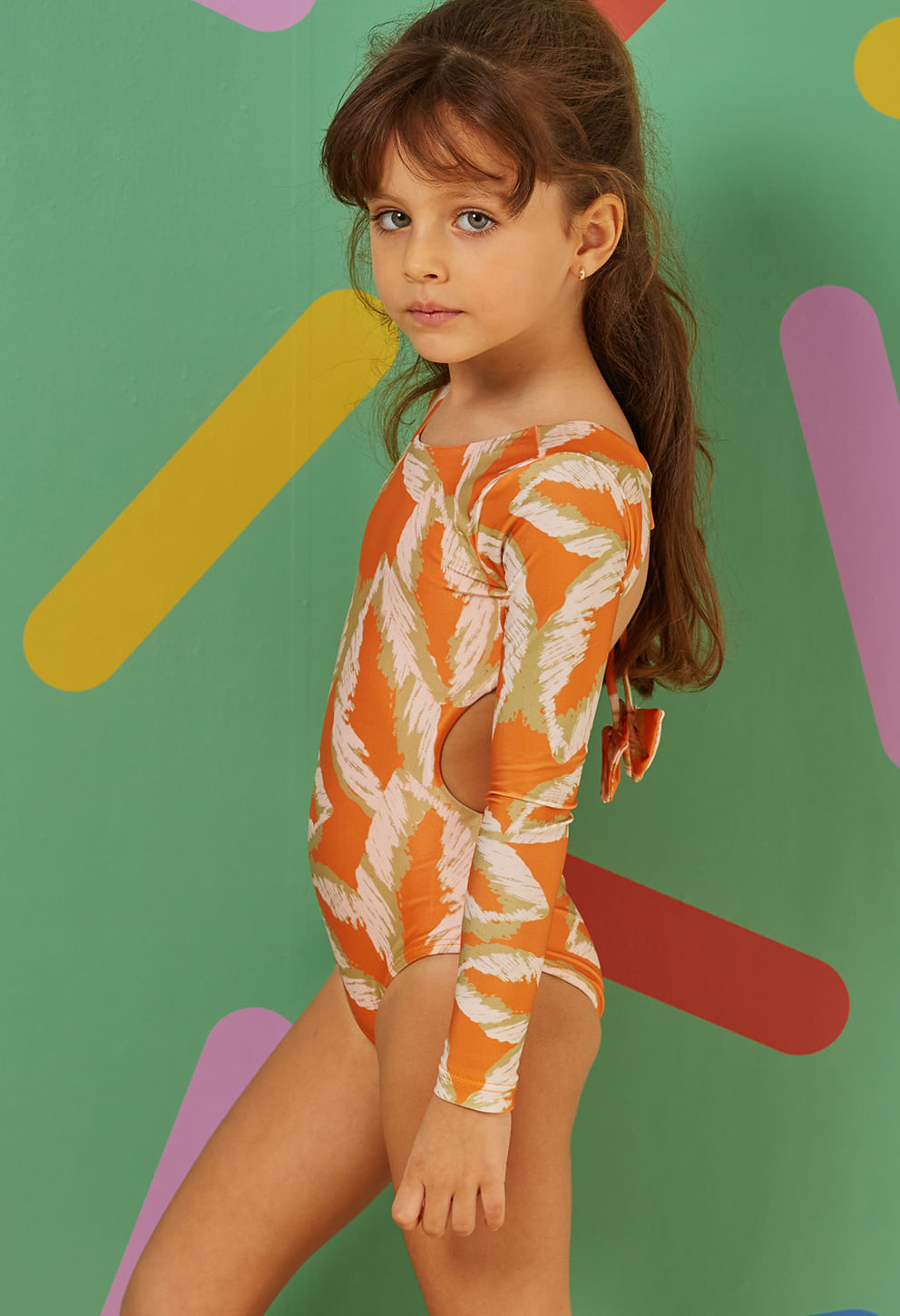 +Maiô infantil engana mamãe com estampa de folhas, mangas longas e laço nas costas — conforto e proteção para brincar na praia ou piscina com estilo.