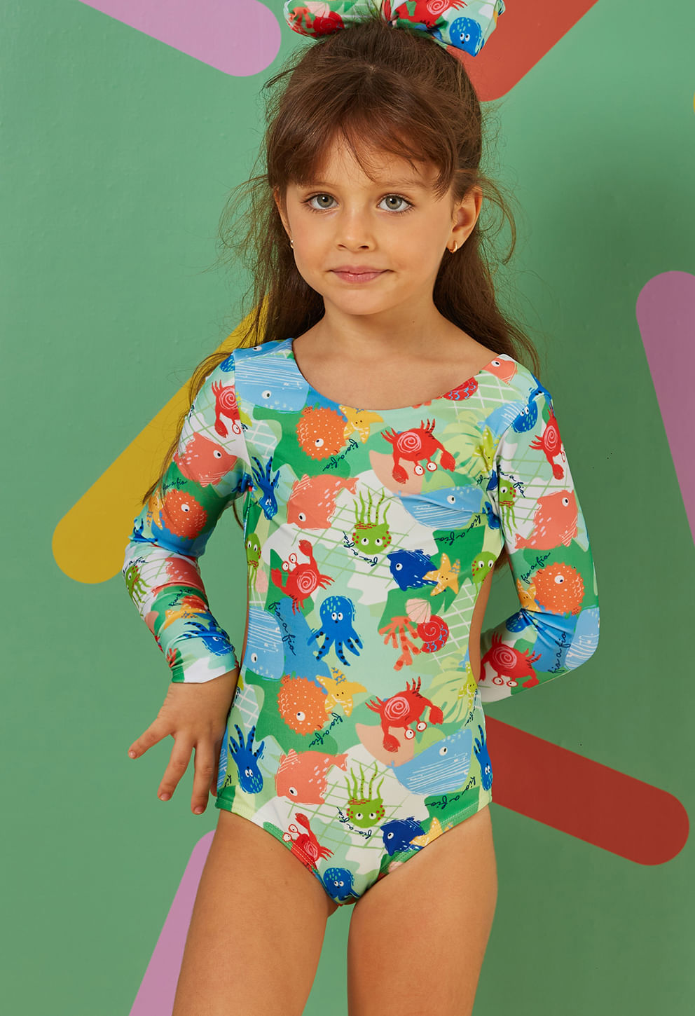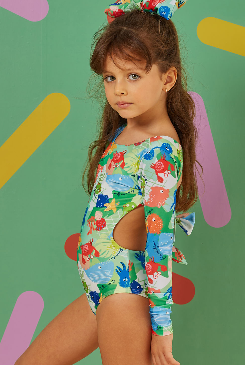 É um visual charmoso e ideal para as meninas aproveitarem a praia ou a piscina, o modelo possui decote redondo, mangas longas e amarração nas costas e ponteiras de laço.