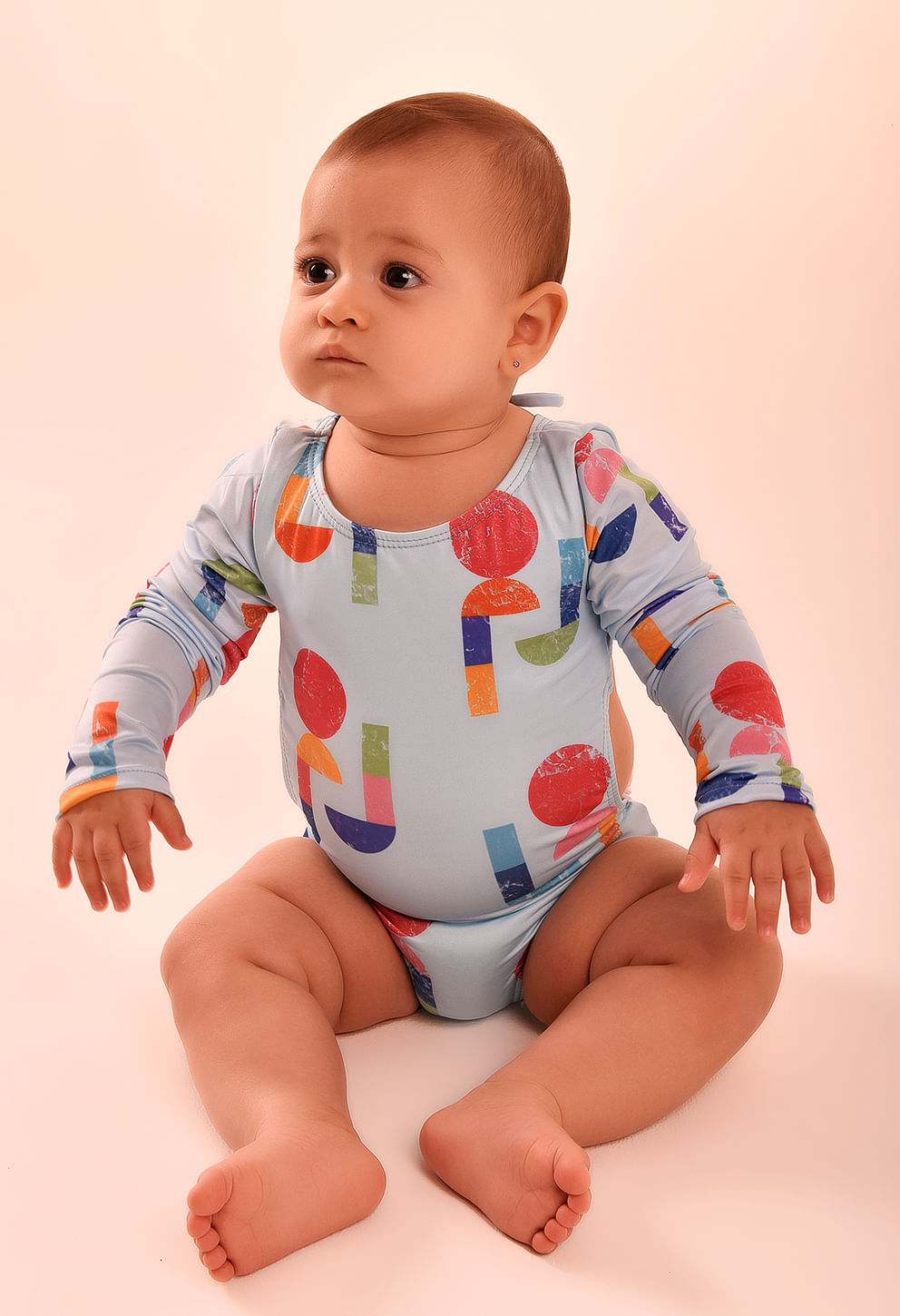+Maiô infantil com mangas longas, decote redondo e amarração nas costas; estampa divertida estilo Pac Man em azul claro, confortável e seguro para dias