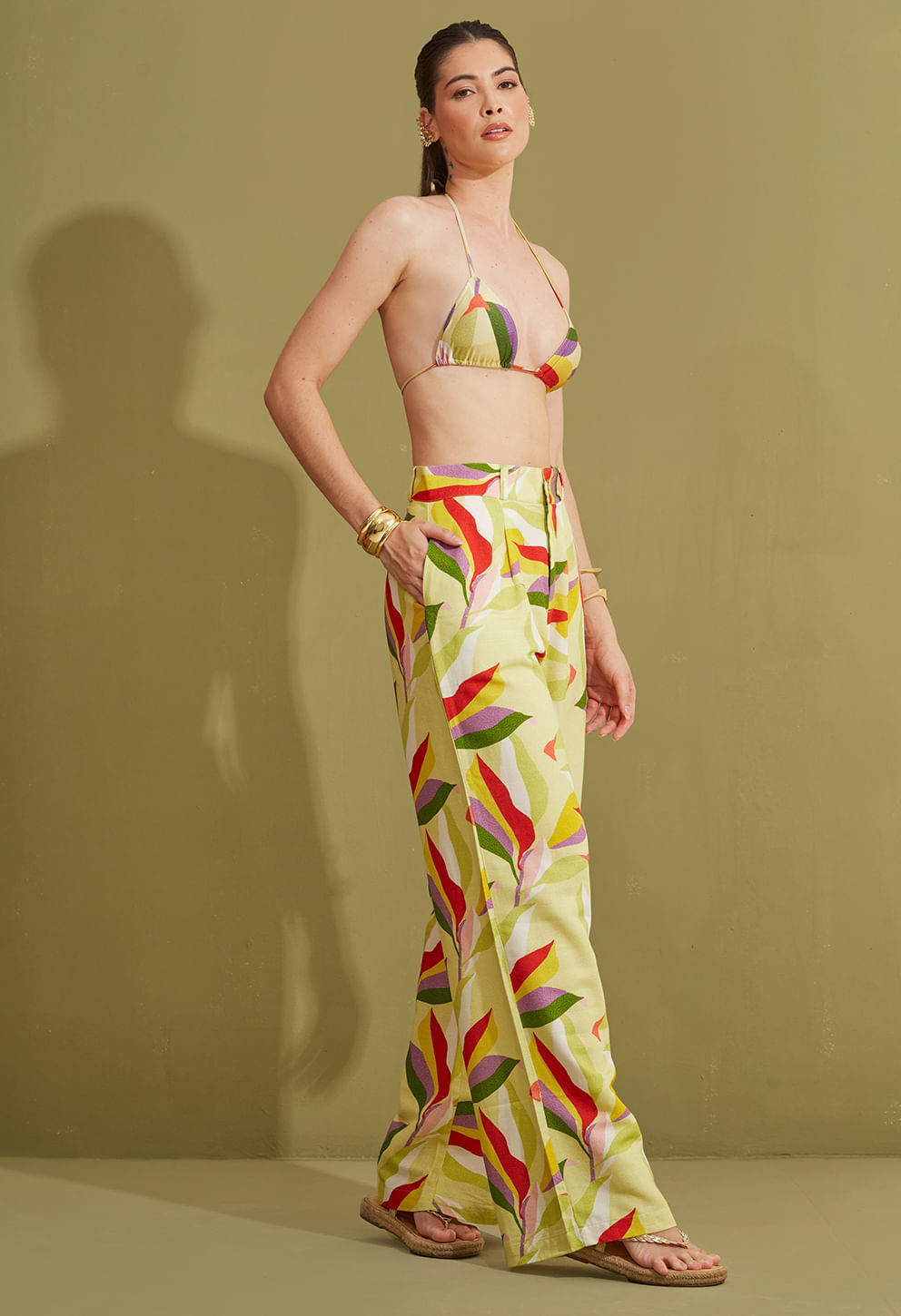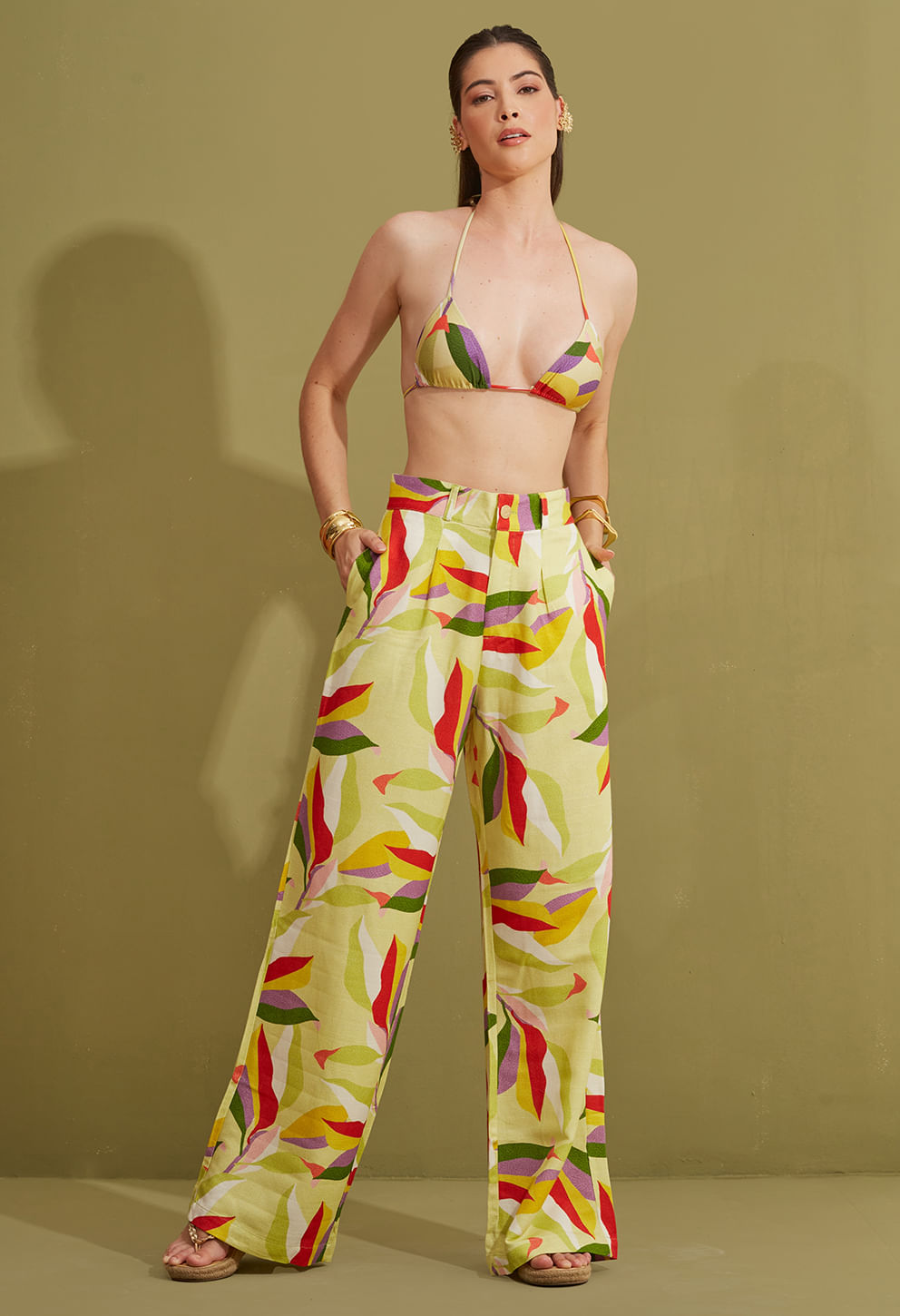 É uma peça fundamental para o seu guarda-roupa, super versátil e muito confortável. É ideal para transitar do beachwear ao casual, reunindo as últimas novidades da estação para um toque sofisticado, elegante e atemporal. A pantalona possui fechamento em zíper e botão, além de bolsos nas laterais. Todos os aviamentos dourados possuem banho em ouro.