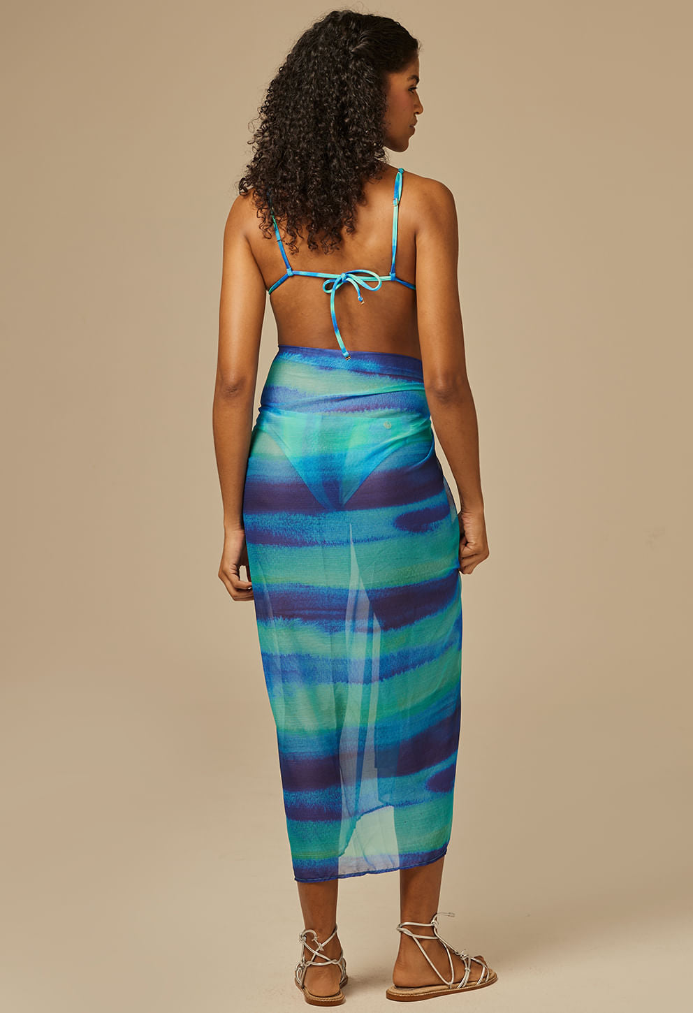 +Pareô leve e fluido com estampa em tons de azul, verde e roxo, ideal para dias ensolarados na praia.