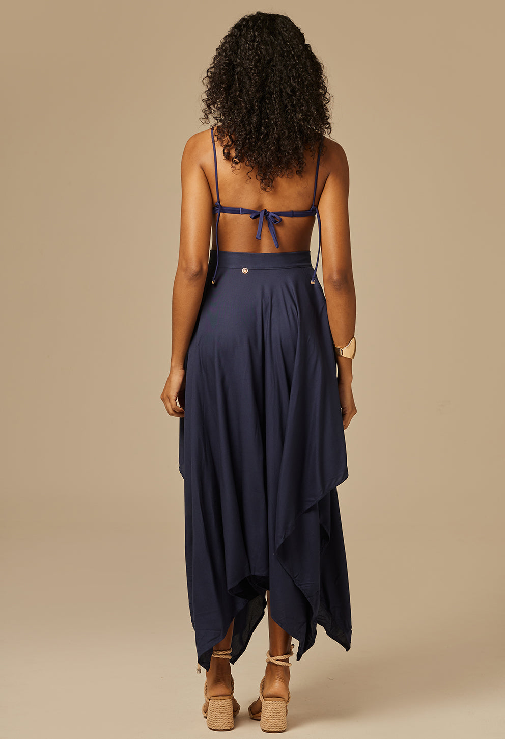 Cintura alta e barrado assimétrico valorizam a silhueta.
