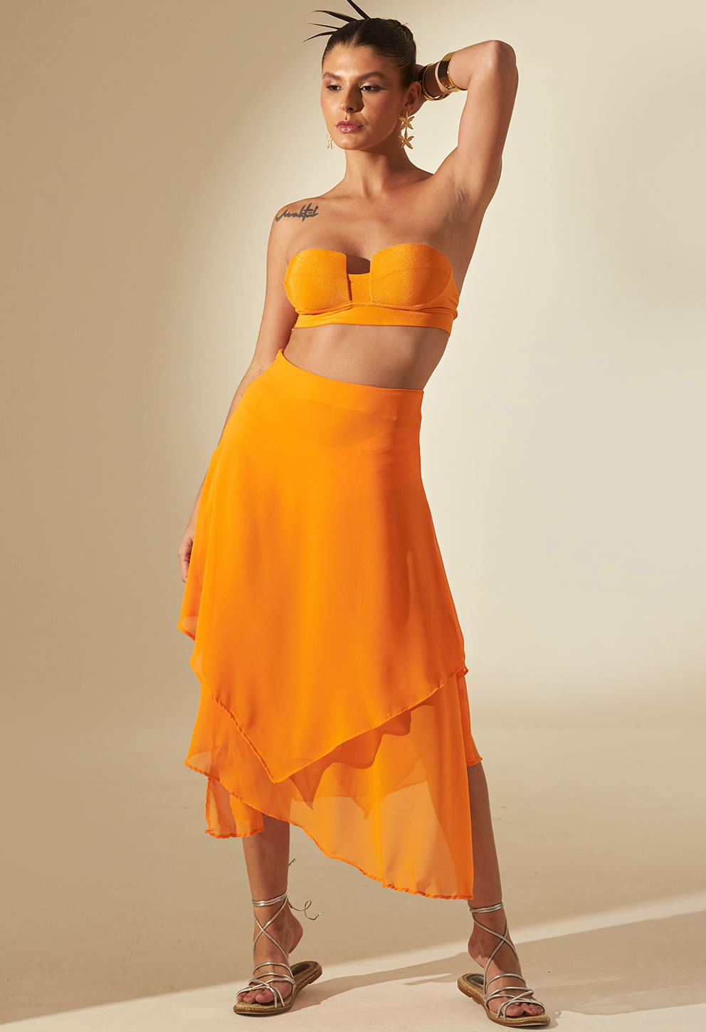 Dica Fio a Fio: Para um look sofisticado e atemporal, combine a Saia Jéssica Falésia com o Body Lua Falésia.