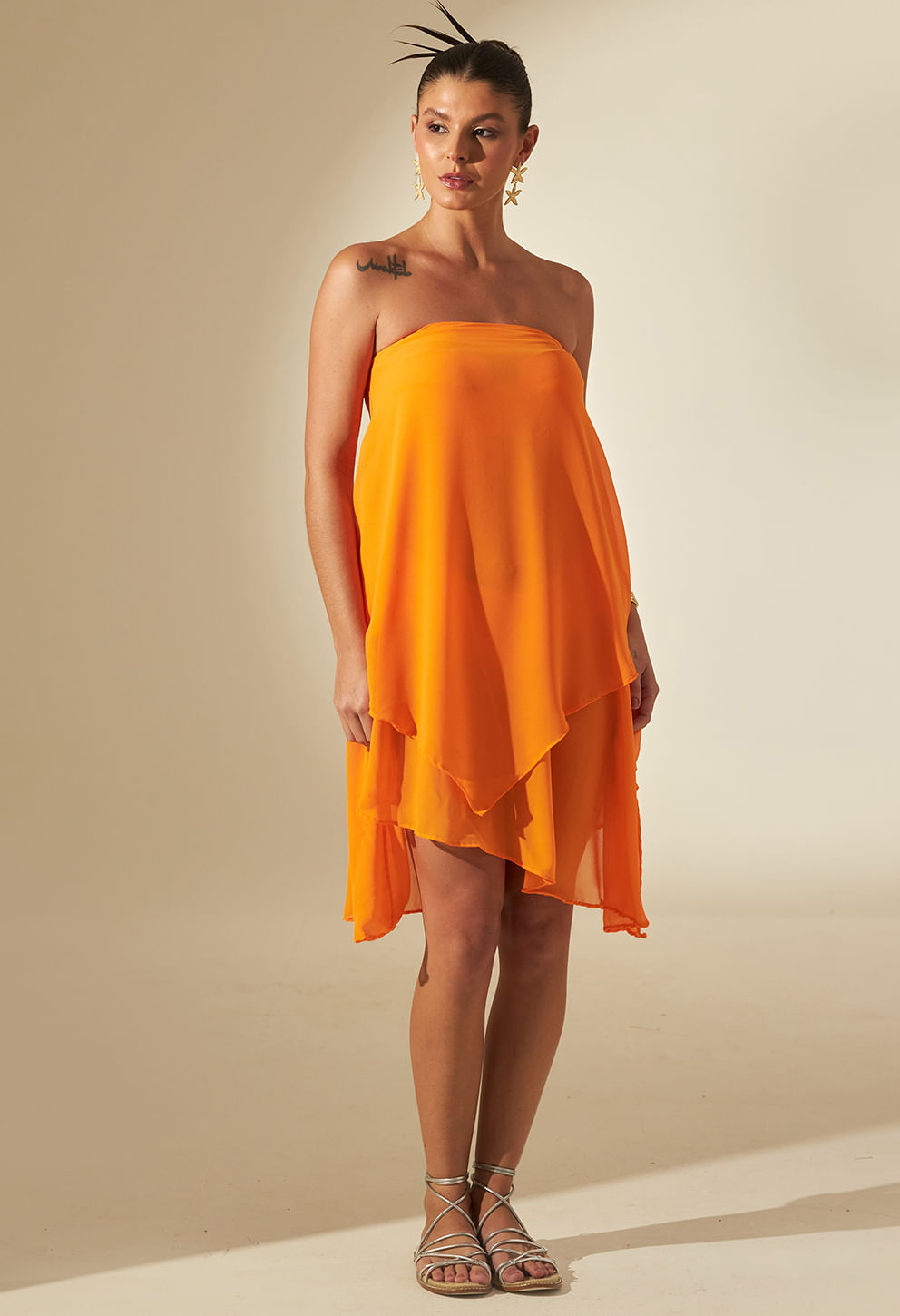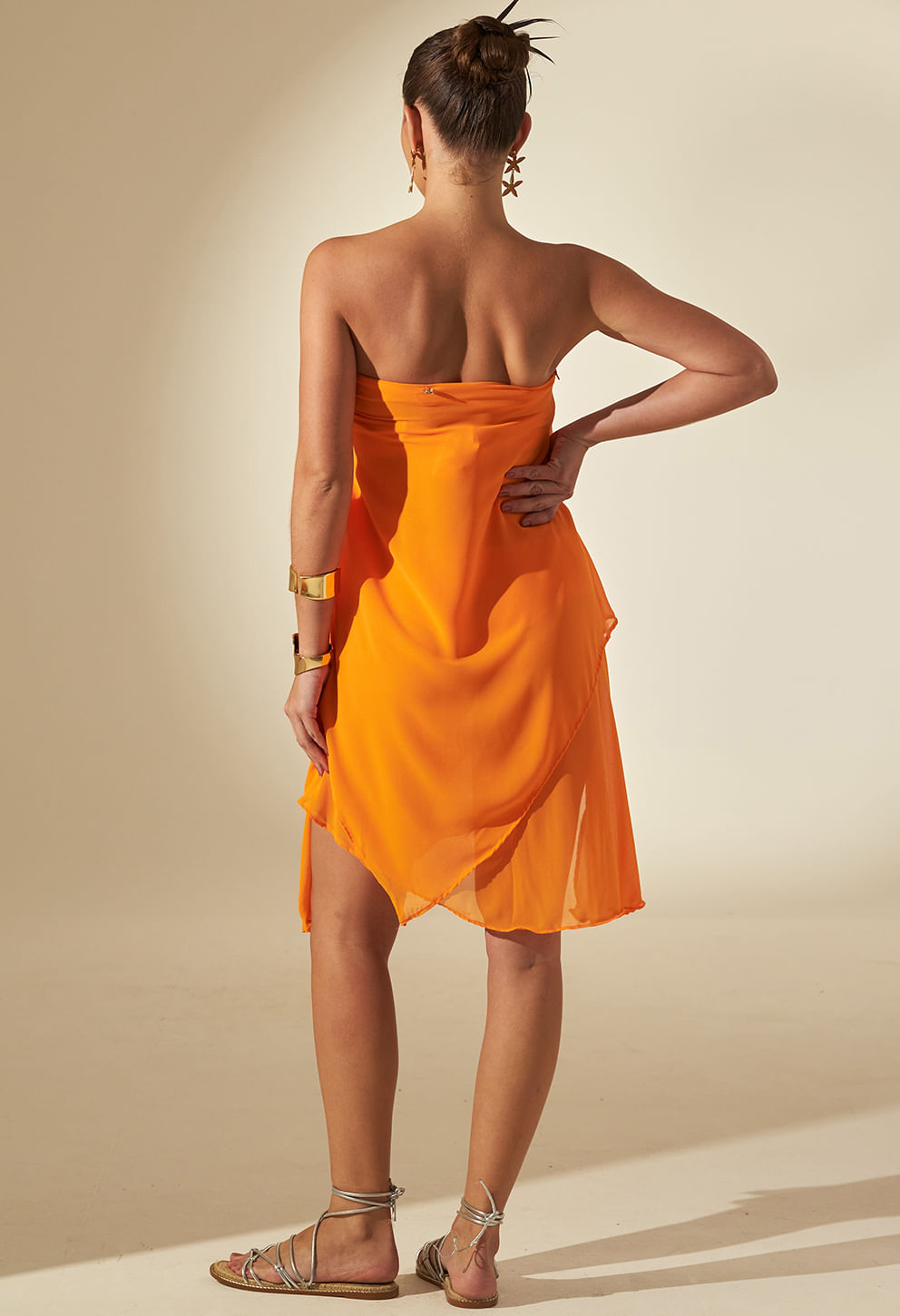Possui modelagem de comprimento midi com amarração na cintura e trás um detalhe charmoso frontal de leve caimento de tecido, a peça garante uma produção atemporal sendo uma aposta absoluta para todos os momentos da praia aos dias na cidade. Todos os aviamentos dourados possui banho em ouro.