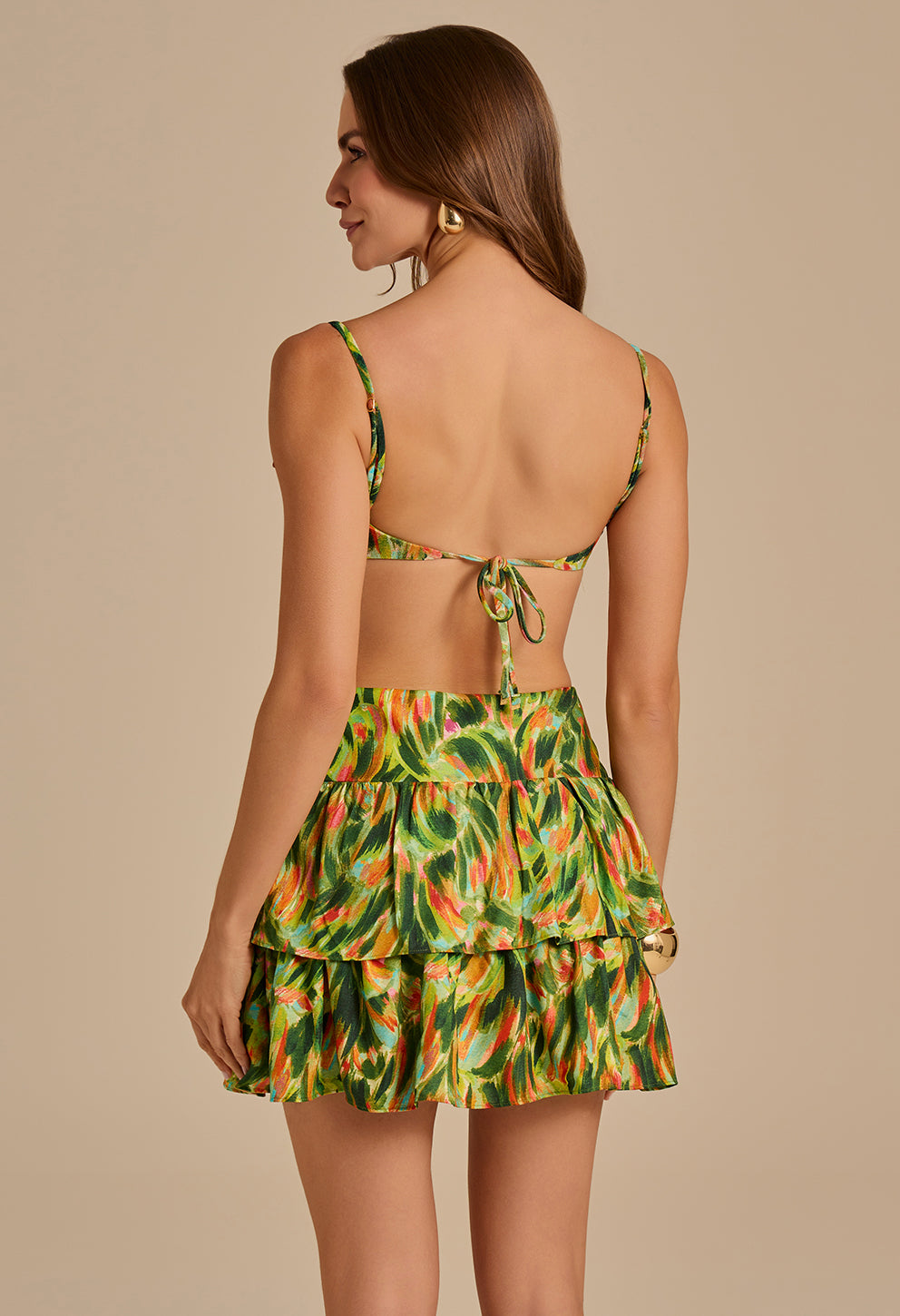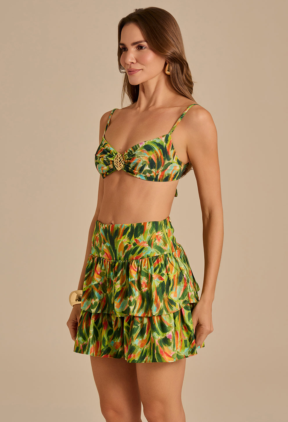 +A Saia Duda se destaca pela sua modelagem curta em camadas de babados, que cria um efeito visual leve e divertido, balançando a cada passo. O tecido, de toque suave e caimento leve, é ideal para os dias de calor, proporcionando uma sensação de frescor enquanto você se diverte. Extremamente versátil, a Saia Duda é a escolha certa para cobrir o biquíni com muito charme e pode facilmente ser combinada com o top coordenado para um conjunto fresh e tropical. Use-a em passeios à beira-mar, beach clubs ou em qualquer ocasião casual de verão. Vista a Duda e adicione leveza e alegria ao seu look! Todos os aviamentos dourados são banhados a ouro.