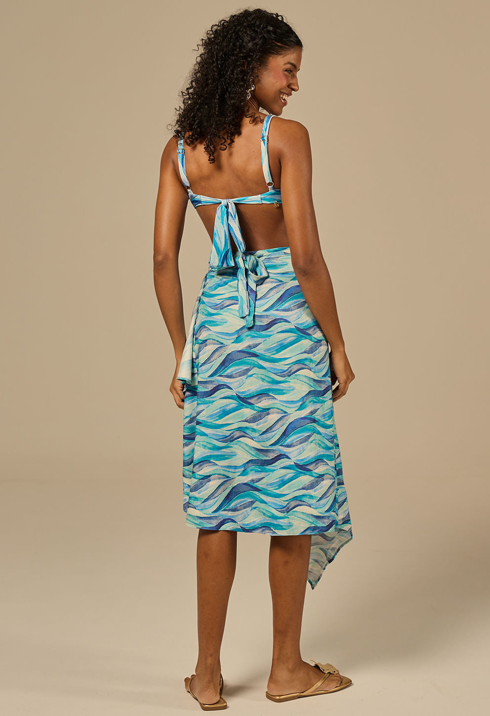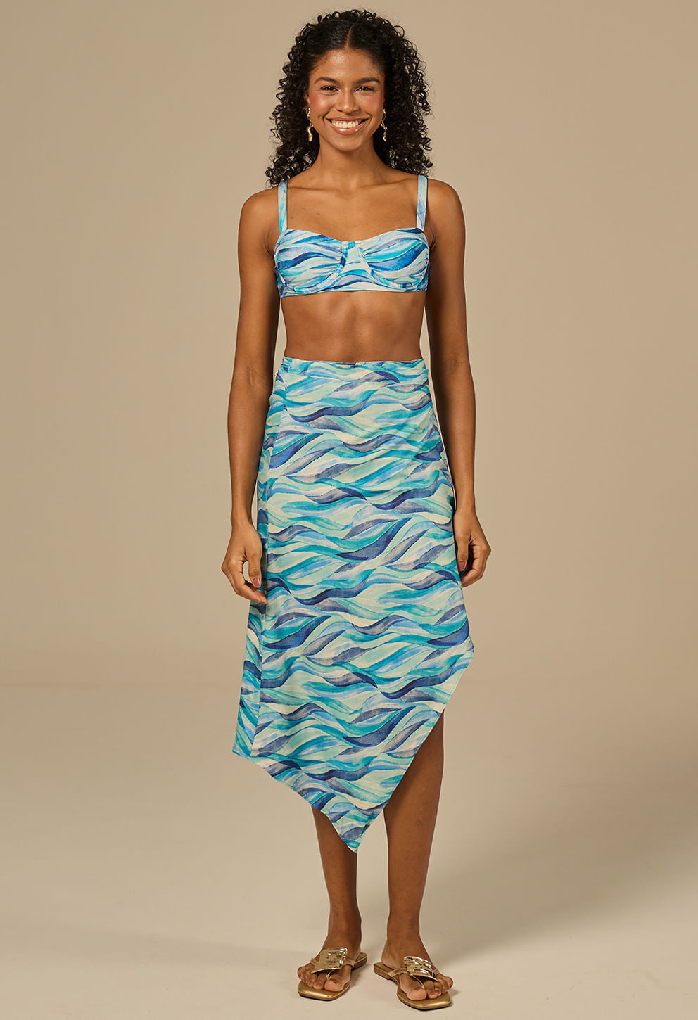 A saia possui um caimento fluido e elegante, com design assimétrico que adiciona um toque moderno ao look. É uma peça versátil, ideal para proporcionar conforto e estilo em diversas ocasiões. e transita do casual para o beachwear facilmente. Todos os aviamentos dourados são banhados a ouro.