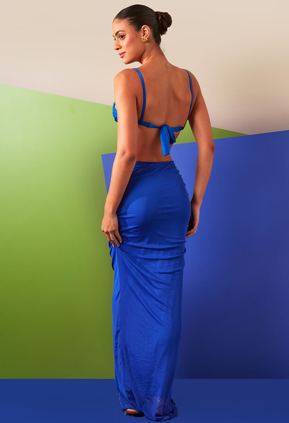 Possui design longo, forrada, e com franzidos laterais. O tule é um material de destaque para incorporar a transparência no resortwear, além disso a saia pode ser usada em formato de vestido sem alça. No traseiro possui placa dourada em formato de lua banhada a ouro.